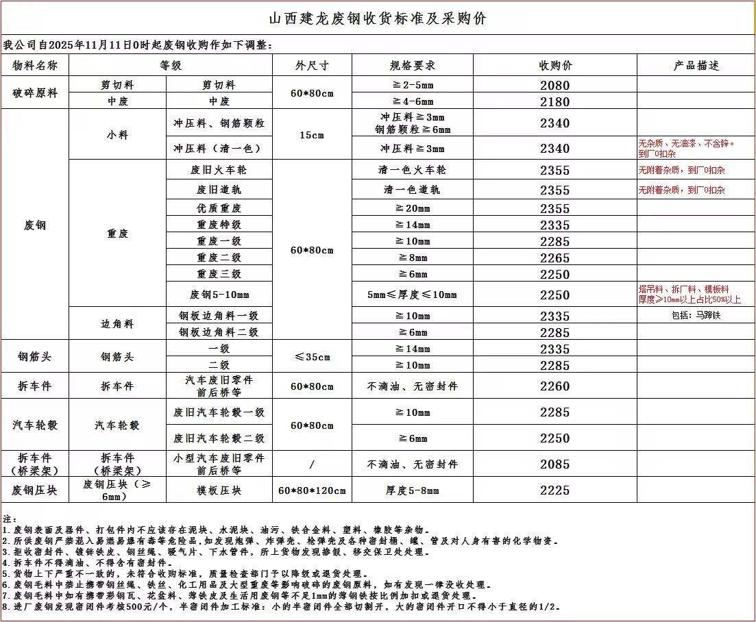 **日山西建龙废钢:剪切料****,中废****,小料****,废旧火车轮****,优质重废****,重废特级****重废一级****重废二级****重废三级****,钢板边角料一级****钢板边角料二级****钢筋头一级****钢筋头二级****拆车件****不含税。