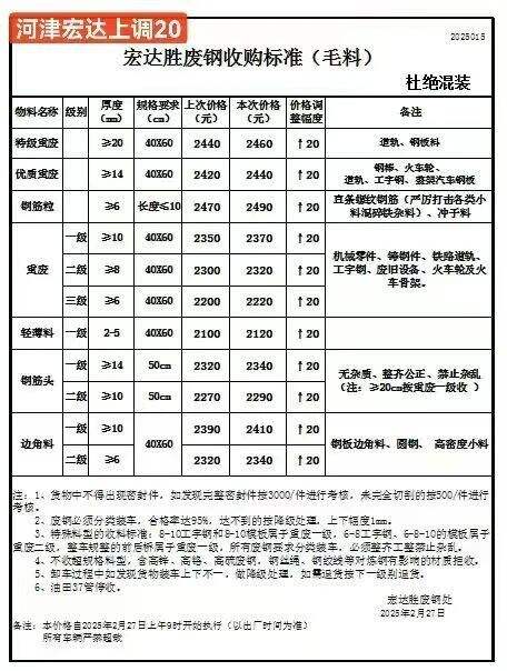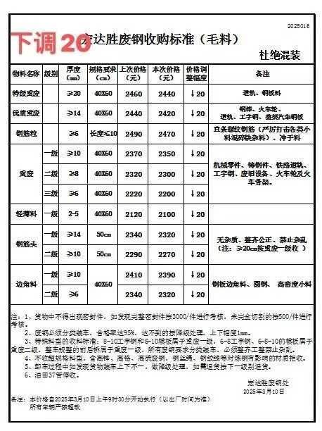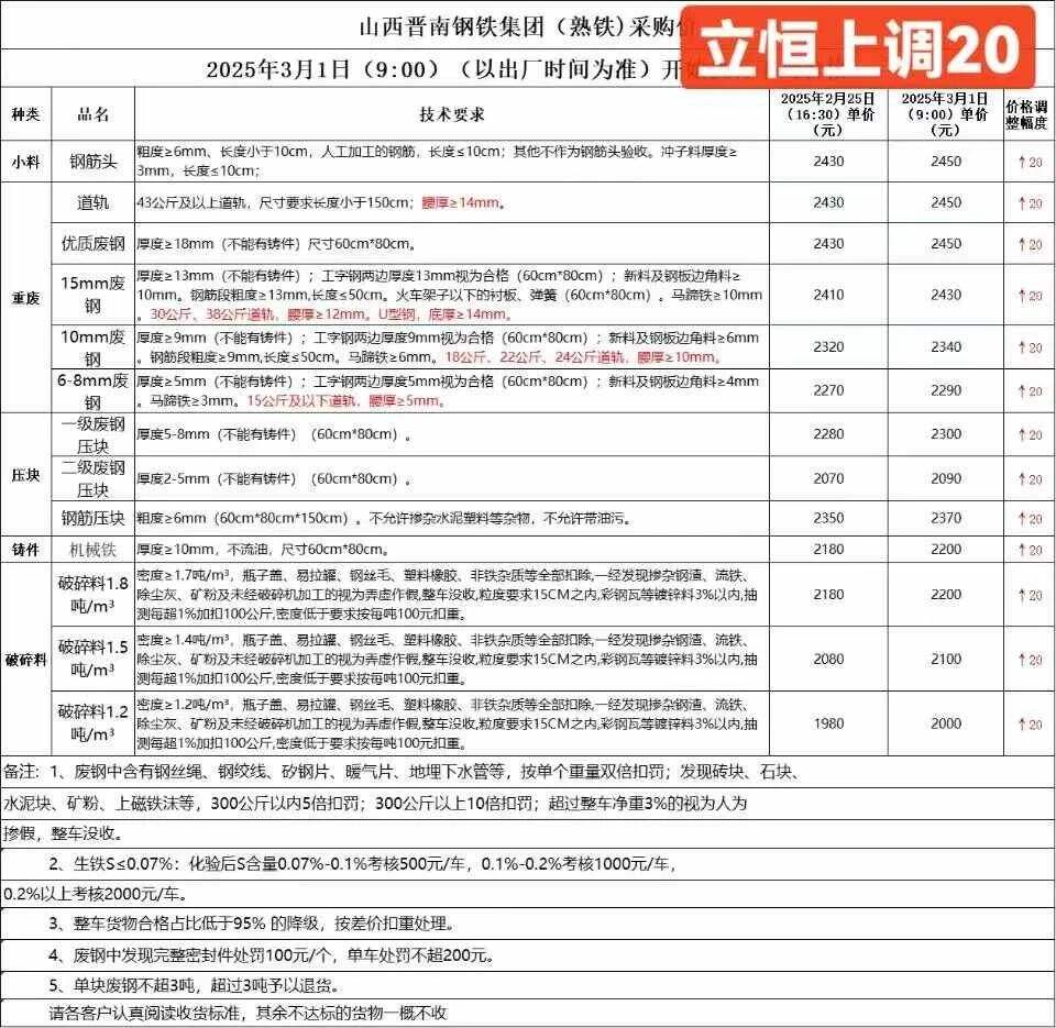 通知:从****年*月**号*时废钢统一上调**元/吨,废钢车辆下午五点半之前进厂,两公里外必须把水箱水放干净,长信能源处,**日长信废钢,钢板毛料****,钢筋团毛料****,道轨毛料****-****,毛料****-****,机械生铁****,剪切料****,统料****,混料****,一级料****,准一级料****,重废****,优质料****-****