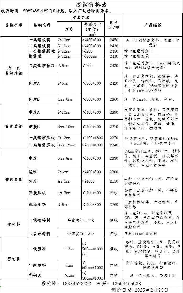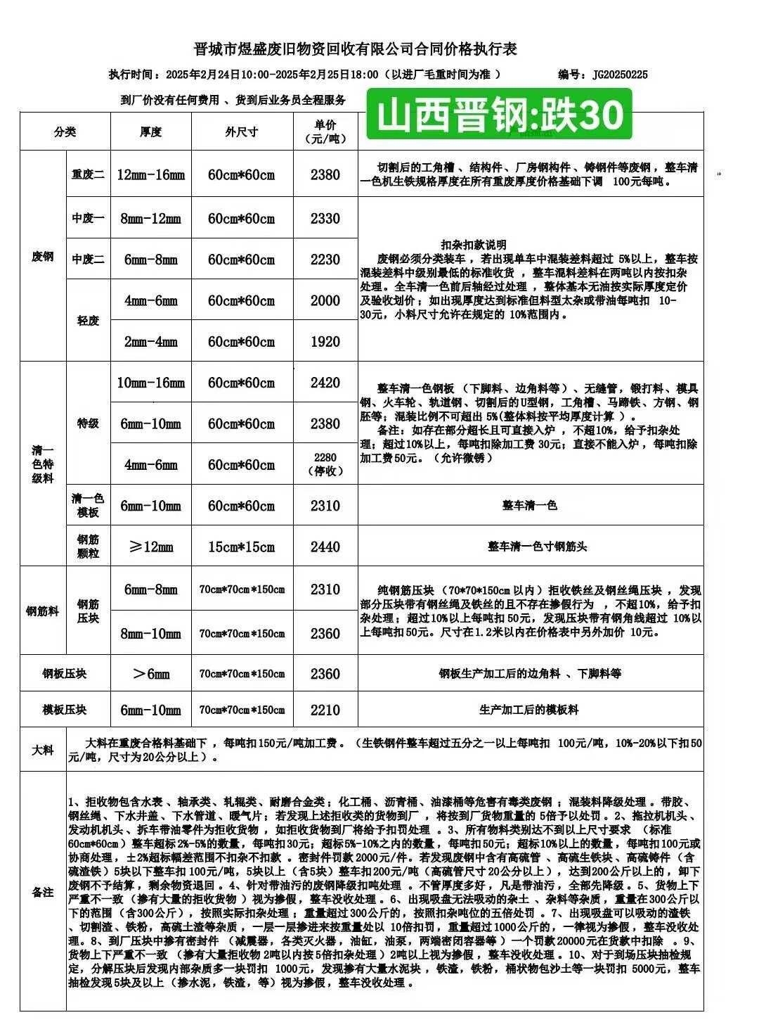 废钢各料型下调**执行以下价格
