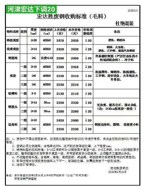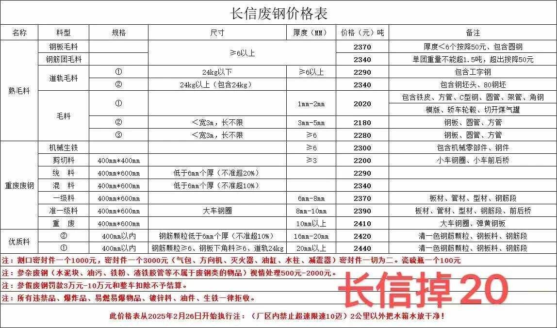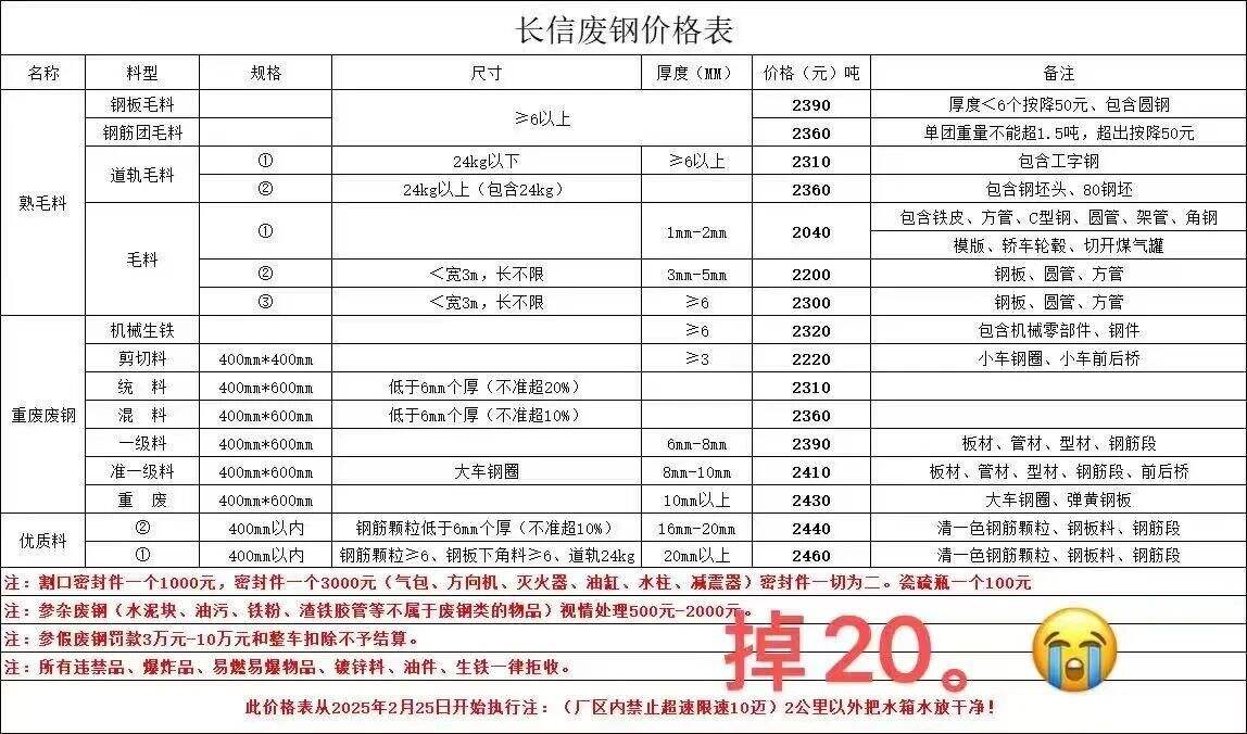 通知:从****年*月**号*时废钢统一下调**元/吨,废钢车辆下午五点半之前进厂,两公里外必须把水箱水放干净,长信能源处,**日长信废钢,钢板毛料****,钢筋团毛料****,道轨毛料****-****,毛料****-****,机械生铁****,剪切料****,统料****,混料****,一级料****,准一级料****,重废****,优质料****-****