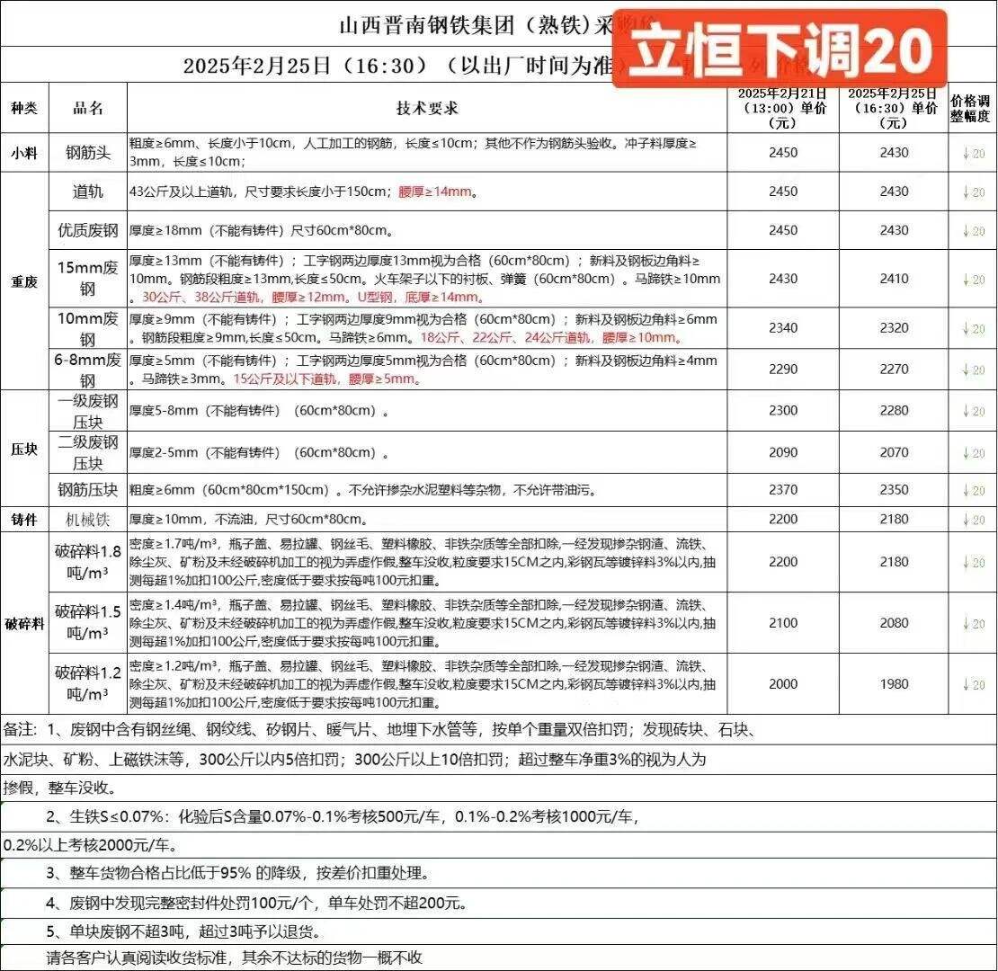 ****年*月**日时起,吕梁建龙所有料型不含税下调**元/吨,**日吕梁建龙废钢最新跌**,剪切料****,冲压料****,钢筋头****,废旧道轨****,废旧火车轮****,优质废钢****,重废特级****,重废一级****,重废二级****,重废三级****,中废****,钢板边角料一级****,钢板边角料二级****,一级****,二级****,钢筋压块停收,汽车前后桥****