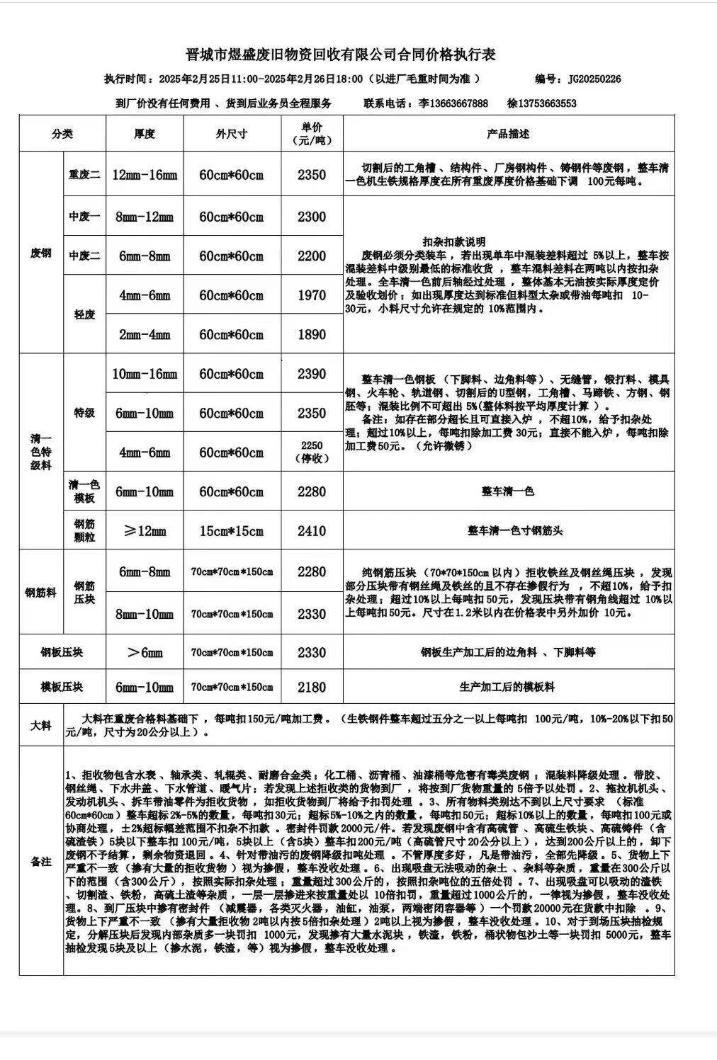 山西华鑫源钢铁集团通知,****年*月**日**时起,废钢各料型下调**执行以下价格,钢筋颗粒(直径*mm以上,长度**cm以下)****元/吨,特级重废(**mm以上)****元/吨,优质重废(**mm以上)****元/吨,重废一级(**mm以上)****元/吨,重废二级(*mm以上)****元/吨,重废三级(*mm以上)****元/吨,钢筋压块****元/吨,中废(*-*mm)****元/吨
