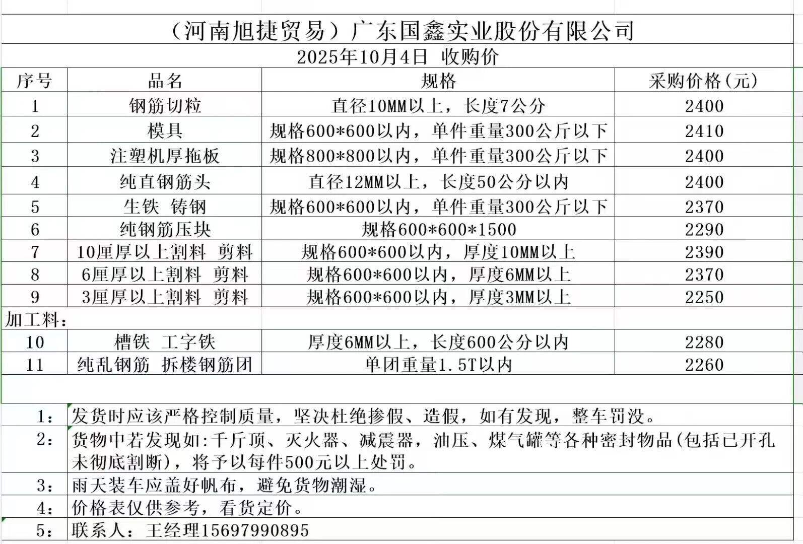 *日广东揭阳国鑫废钢调整部分涨**,*公分钢筋切粒****,模具****,注塑机厚拖板料****,纯直钢筋头****,生铁****,纯钢筋压块****:**厘厚以上割料剪料****,*厘厚以上割料剪料****,*厘厚以上剪料****,槽铁、工字铁****,纯乱钢筋、拆楼钢筋团****