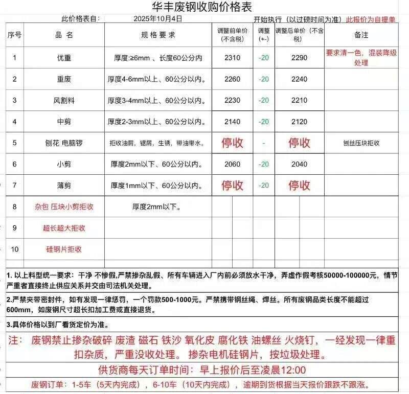 *日忠信华丰钢铁废钢跌**:优重****,重废****,风割料****,中剪****,刨花停收,小剪****,薄剪停收。自提注禁止携带密封等危险品