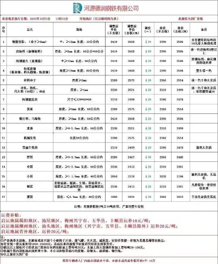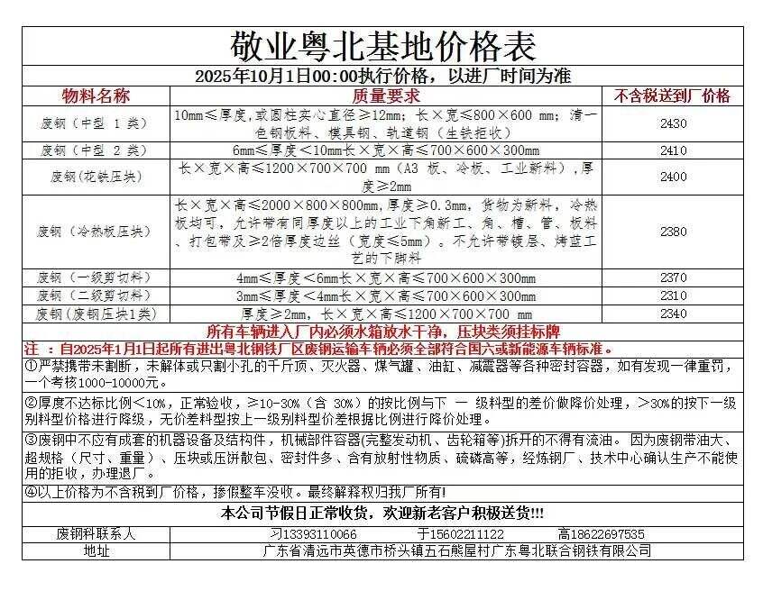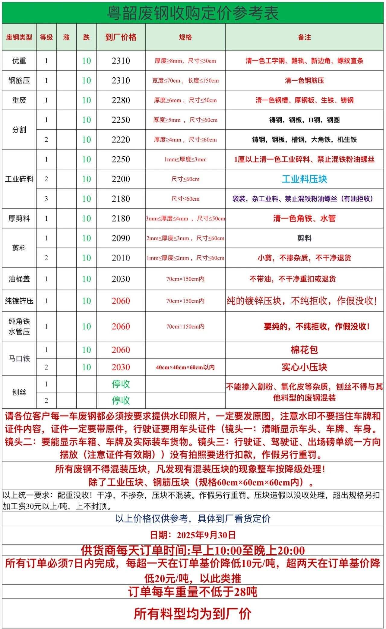 *日广东南方东海废钢跌**元,新边角料一级****,新边角料二级****一****,马蹄铁****,特优****,优重****,重废****,厚剪料****-****,中剪料****-****,小剪料****-****,优质铸铁/生铁****,冷热轧冲料****-****,冲子****,特级破碎料****,一级破碎料****,大钢刨(厚)****,普通刨花、碎屑停收,纯钢筋压停收,清一色****,彩钢瓦****