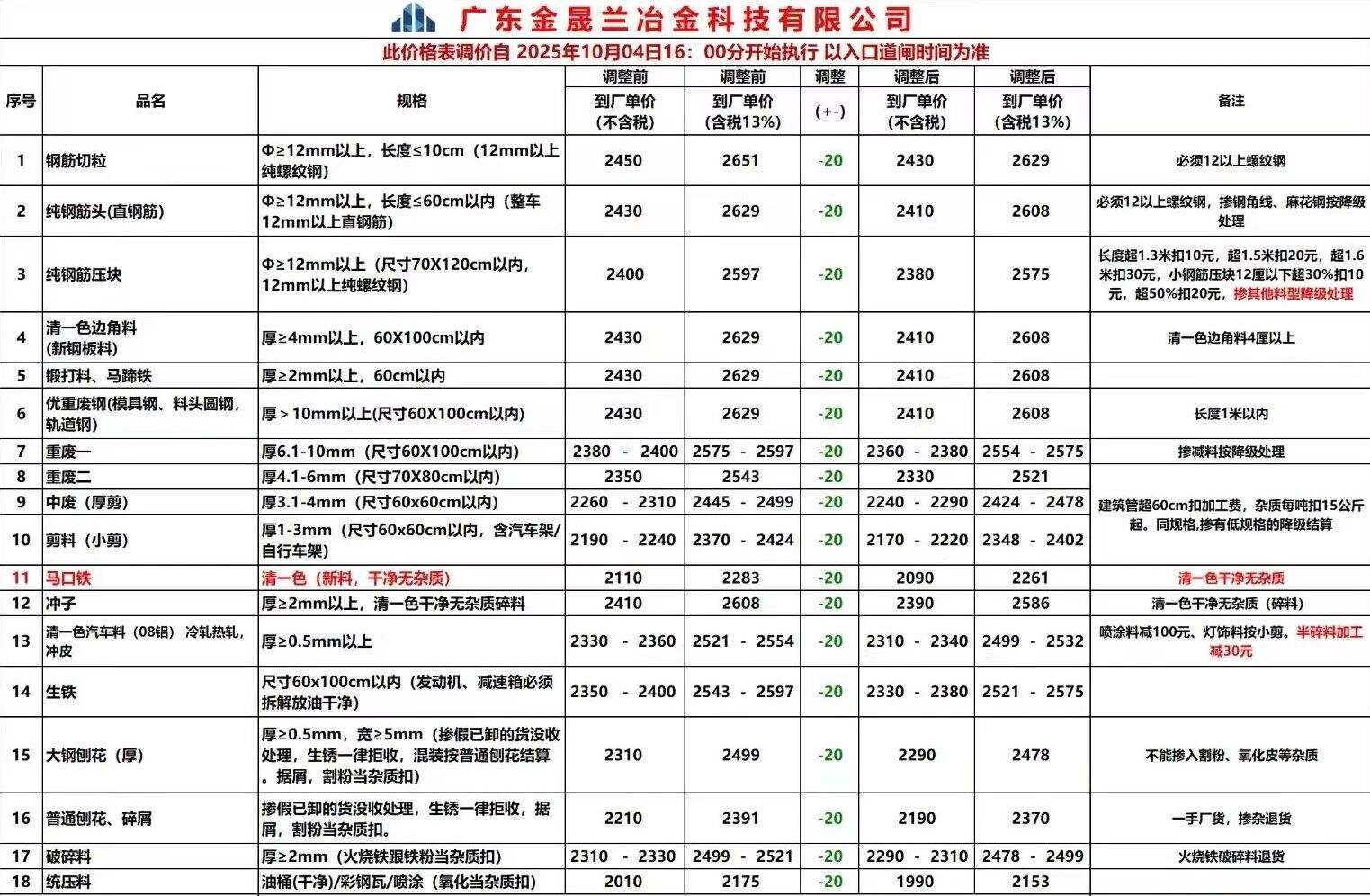 广东金晟兰冶金科技有限公司,**月*日**:**跌**元,(以入口道闸时间为准)广东金晟兰冶金科技有限公司,纯钢筋头****,冲子****,钢筋压块****,清一色边角料****,重废一****-****,重废二****,中废****-****,剪料****-****,清一色汽车料(**铝)****-****,大钢刨花/数控****,普通刨花碎屑****,统压料****,马口铁****