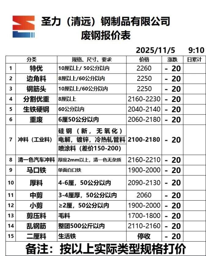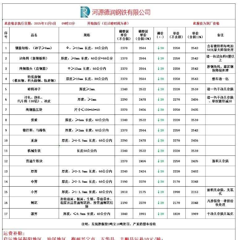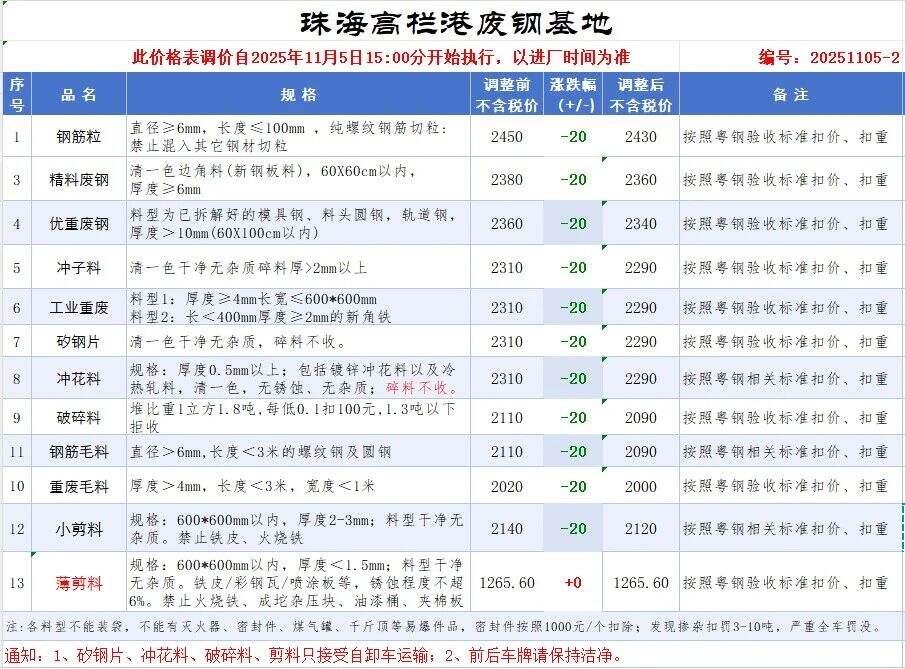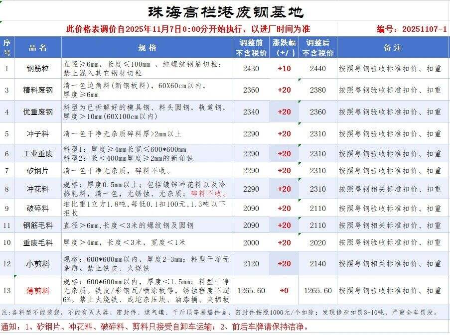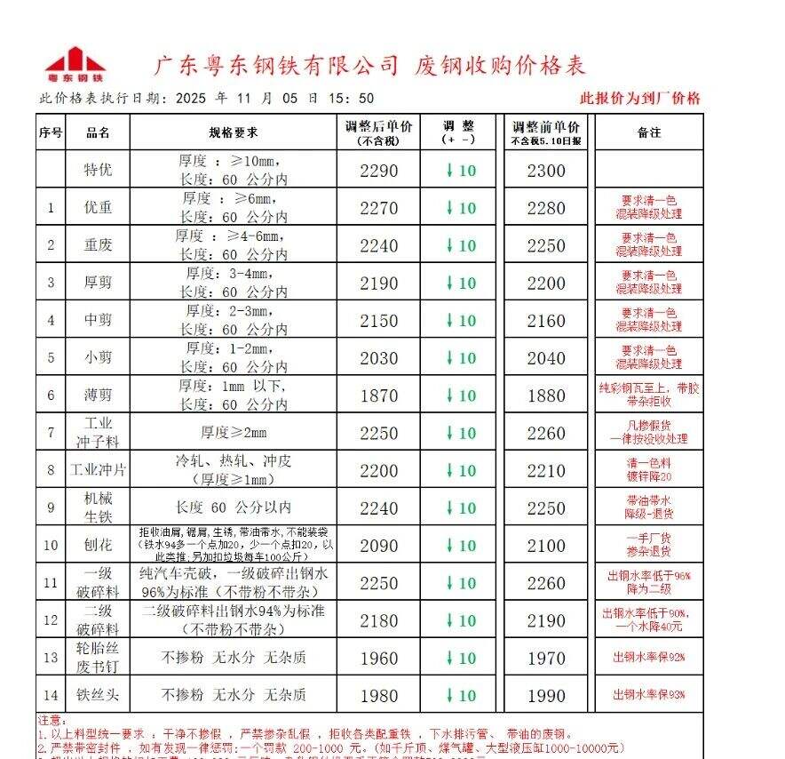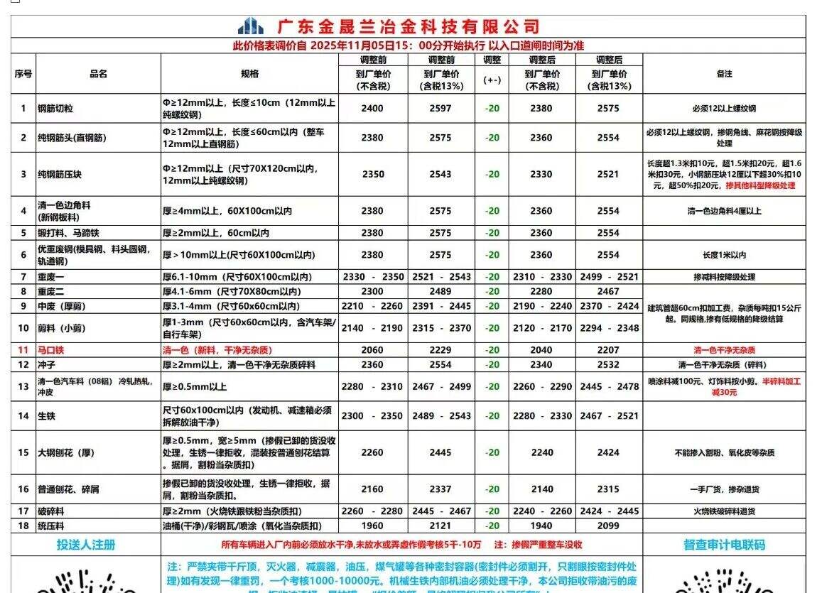*日执行广东南方东海废钢,晚上*点**执行跌**:模具钢****,新边角料一级****,新边角料二级****一****,马蹄铁****,特优****,优重****,重废****,厚剪料****-****,中剪料****一****,小剪料****-****,优质铸铁/生铁****-****,冷热轧冲料****-****,冲子****-****,特级破碎料****,一级破碎料****-****,大钢刨(厚)****-****,普通刨花、碎屑****-****,纯钢筋压停收,清一色****,彩钢瓦****。