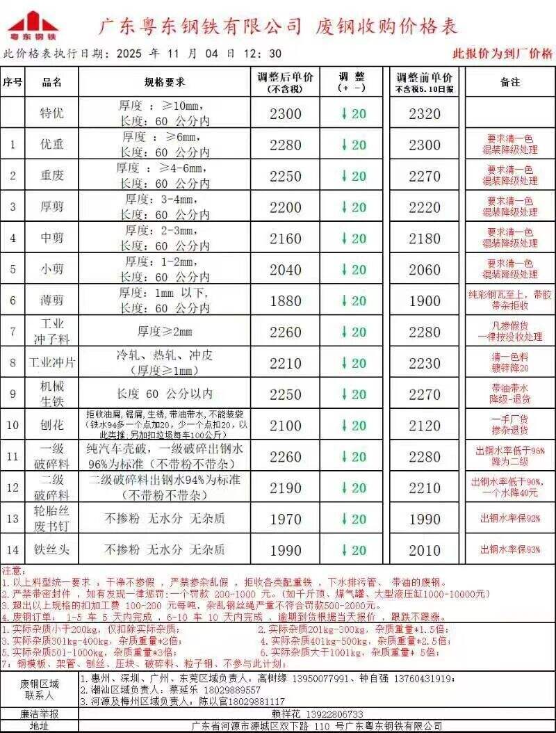 *日清远圣力最新执行价跌**,特优****,边角料****,钢筋头****,分割优重****-****,生铁硬钢****-****,重废****-****,冲料****-****,清一色汽车冲料****-****,马口铁****-****,厚料****-****,中剪****,小剪****-****,剪压料****-****,乱钢筋****-****,二厘料停收,:。具体收购价以厂价表为准。