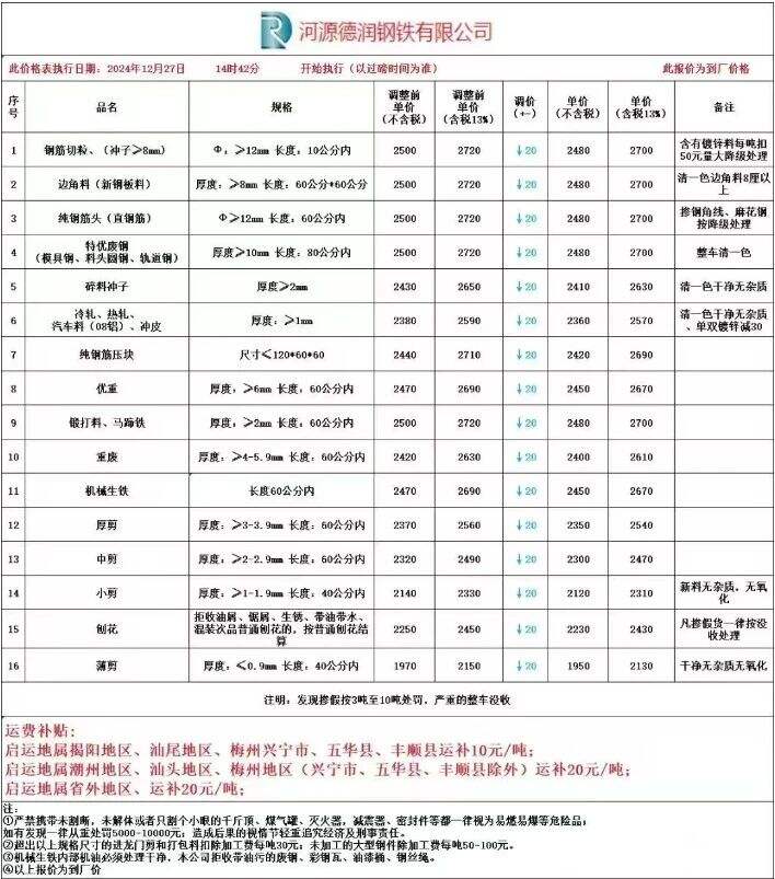 **日河源德润废钢**:**涨**具体价格以厂家价格表为准,**日河源德润涨**,钢筋切粒****,边角料(新钢板料)****,纯钢筋头****,模具钢、料头圆钢****,碎料冲子****,冷轧、热轧、汽车料(**铝)****,纯钢筋压块****,优重****,锻打料、马蹄铁****,重废****,机械生铁****,厚剪****,中剪****,小剪****,刨花****不含税
