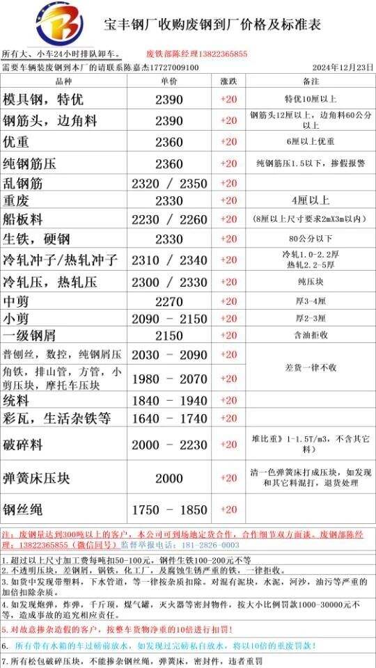 **日江门宝丰废钢涨**,模具钢特优****,钢筋头边角料****,优重****,纯钢筋压****,乱钢筋****-****,重废*-*厘****,船板料****-****,生铁硬钢****,冷热轧冲子****-****,冷轧压/热轧压****-****,中剪****,小剪****-****,一级钢屑****,普刨丝****-****,角铁****-****,统料****-****,彩瓦****-****,破碎料****-****,弹簧床压块****,钢丝绳****-****,不含税
