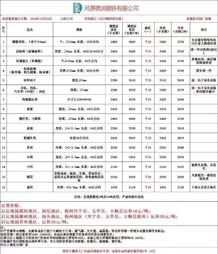 **日河源德润涨**,钢筋切粒****,边角料(新钢板料)****,纯钢筋头****,模具钢、料头圆钢****,碎料冲子****,冷轧、热轧、汽车料(**铝)****,纯钢筋压块****,优重****,锻打料、马蹄铁****,重废****,机械生铁****,厚剪****,中剪****,小剪****,刨花****不含税