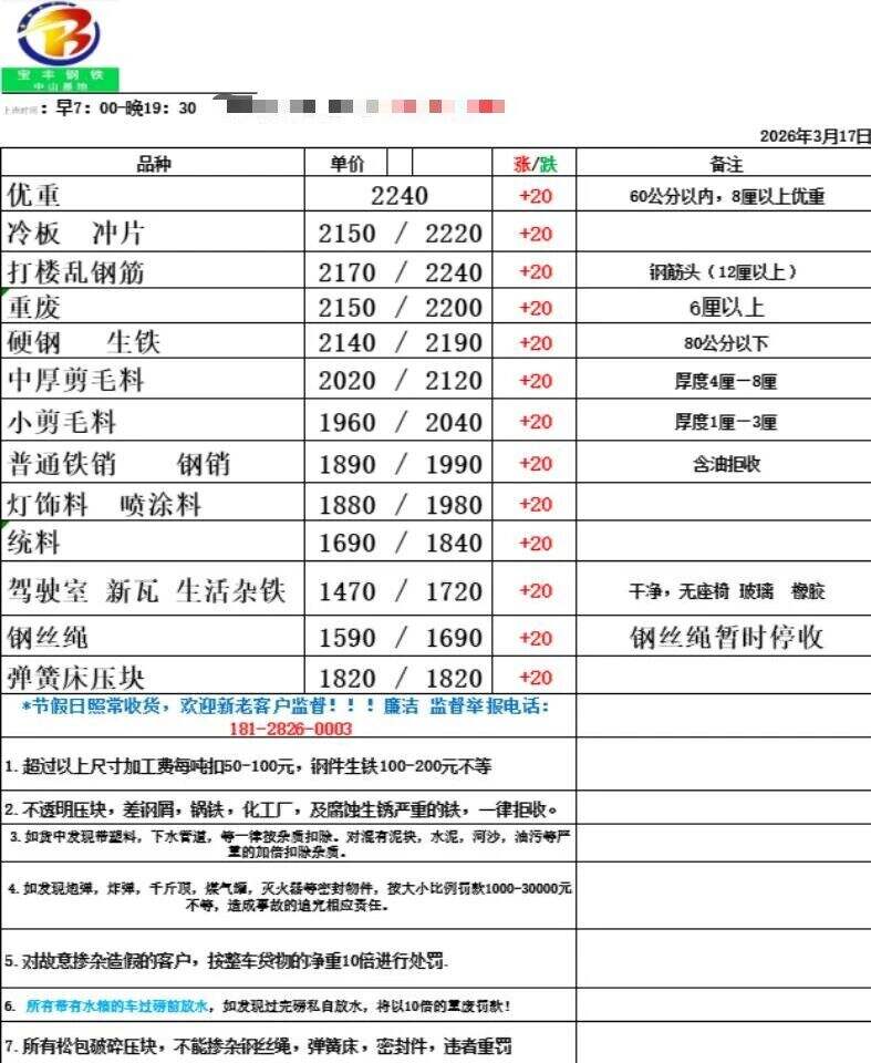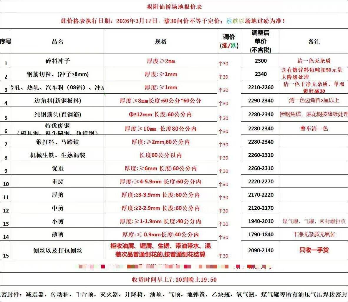 广东欣贸基地废钢调价通知价差标准明细表不变。详见价差明细表编号:XMGD-**-**直采立即执行,场地所有料型统一上调**元,上午**点整执行。(以上调价内容仅针对广东区域)****年**月**日。