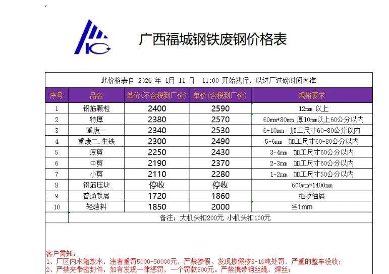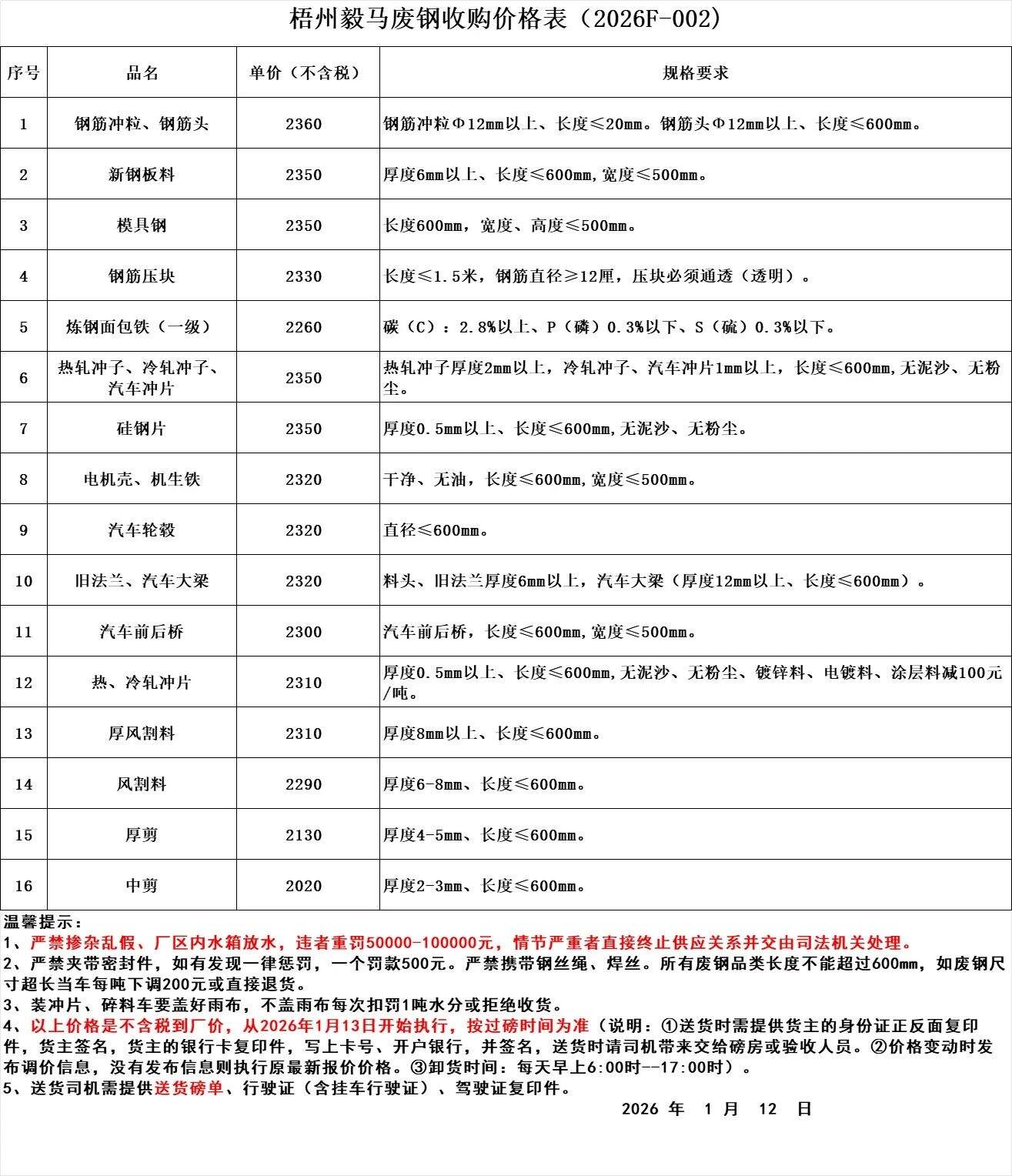贵港废钢采购价格调整通知****年*月**日起废钢采购价格(以报计划为准)具体价格如下:*、铸铁、铸钢件、机械件采购价格上调**元/吨,上调后****元/吨(无税);*、重型废钢采购价格上调**元/吨,上调后****元/吨(无税);*、一级剪料采购价格不变,****元/吨(无税);*、二级剪料采购价格不变,****元/吨(无税);*、轻薄料采购价格不变,****元/吨(无税);*、破碎料采购价格不变,****元/吨(无税);*、整车乱钢筋采购价格不变,****元/吨(无税);*、纯钢筋头采购价格上调**元/吨,上调后****元/吨(无税);*、钢筋压块采购价格上调**元/吨,上调后****元/吨(无税)。