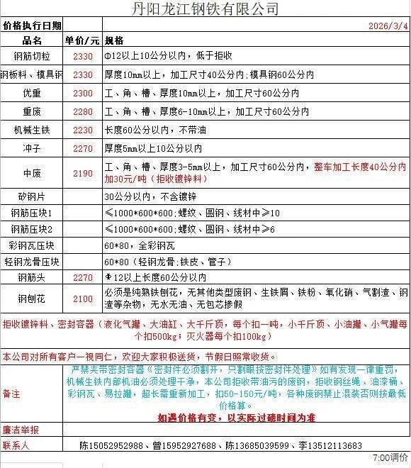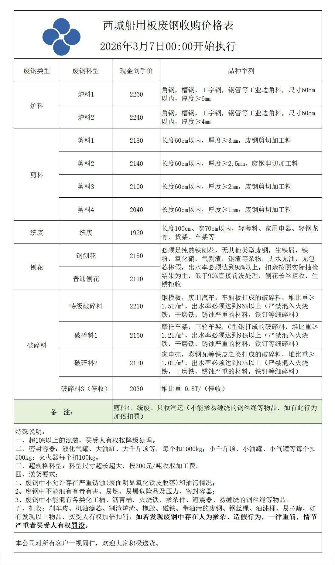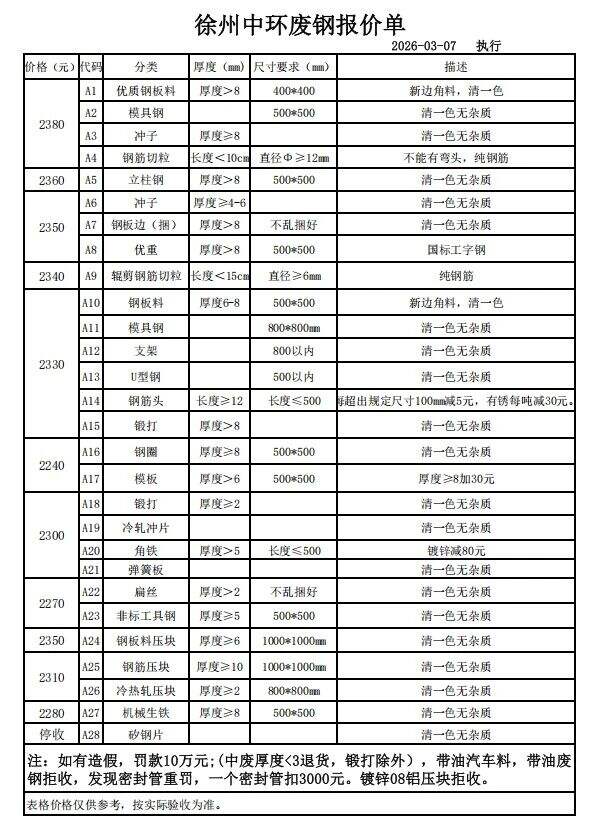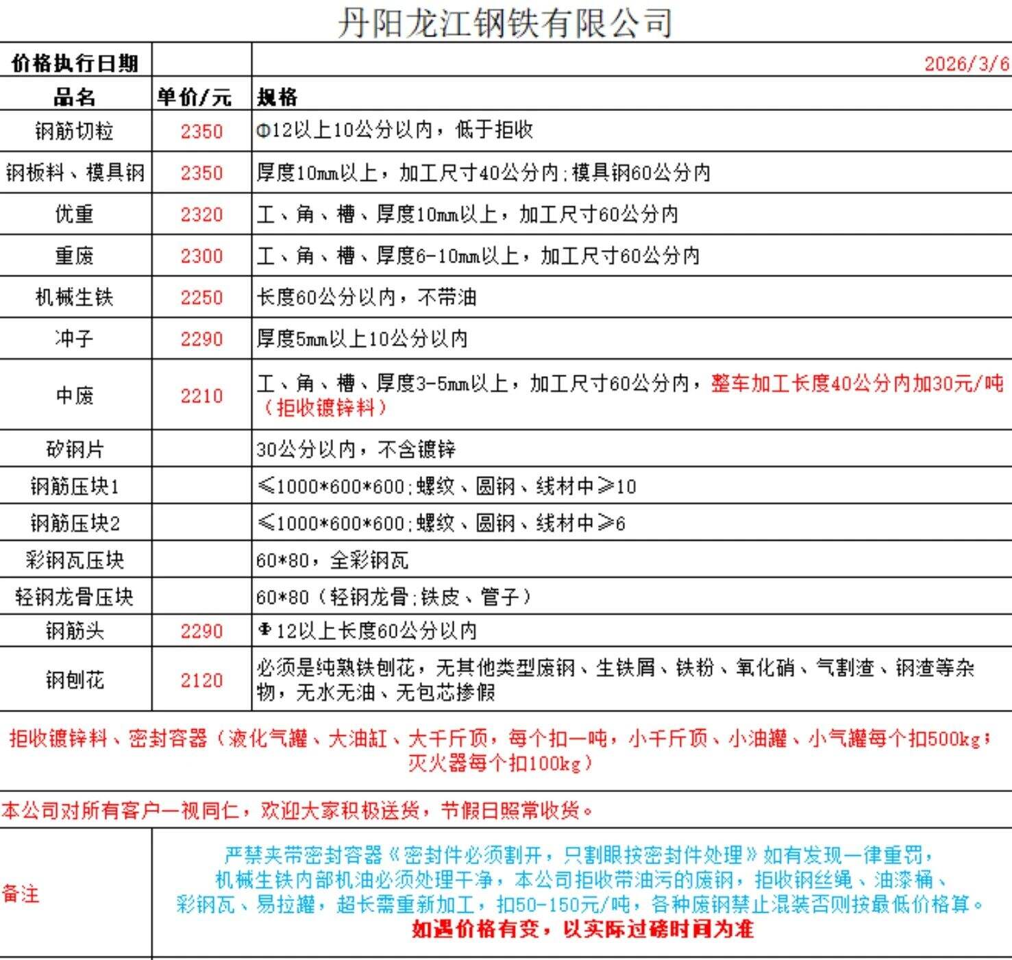 连云港亚新通知:*月*日废钢价格上调**元/吨:一、**毫米厚新钢板料,模具钢,价****元;二、*毫米厚度以上锻打毛边,价****-****元;三、重废A,价****元;四、*毫米厚重废B,价****元;五、*毫米厚中废新料,价****-****元。*毫米厚度以下拒收,车面与车底等级不一,按掺假处理。规格:**X**。超长度需重新加工:(*)占**%以上扣**元/吨(*)占**%以上扣***元/吨(*)化工厂料,带油料,高硫废钢,油漆桶废钢一律拒收。所有密封容器(如:千斤顶,汽车液压顶,各类气瓶,罐,密封管件等),必须彻底切断处理,如未彻底切断,重罚*****元以上/件。