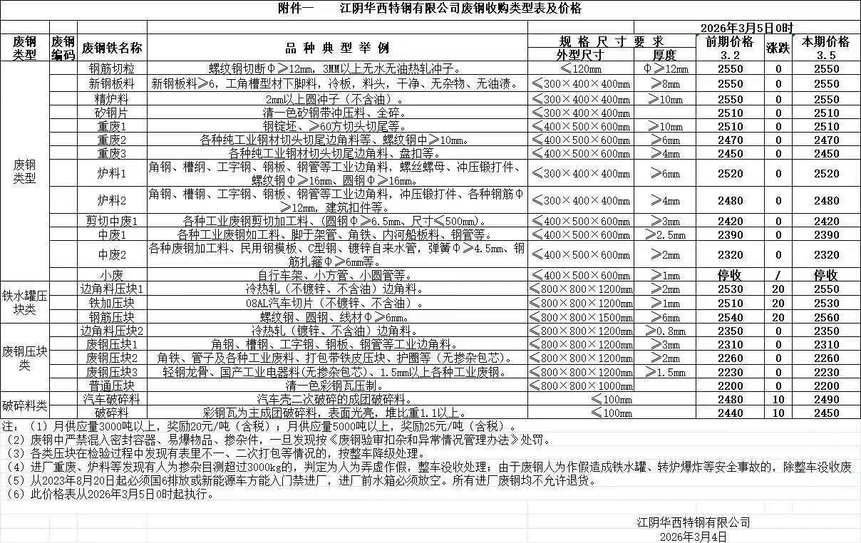 *日江阴兴澄特钢执行价,重废一****,重废二****,中型剪切料一****,中型剪切料二****,中型剪切料三****,小型剪切料一****,小型剪切料二****,小型剪切料三****,轻薄一****,轻薄二****,破碎料一****外购冲豆二****。含税价。
