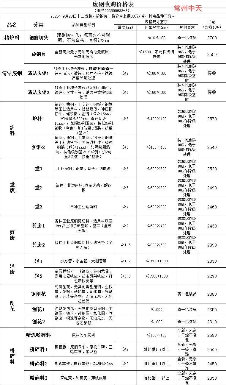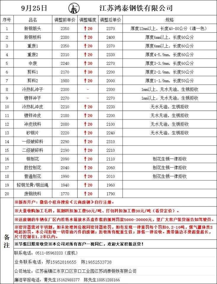 **日镇江鸿泰部分涨**-**:新钢筋头:****,新钢板料:****,重废*:****,重废*:****,中废:****,剪料*:****,剪料*:****,冷热轧冲子:****,镀锌冲子:****,冷热轧冲皮:****,镀锌冲皮:****,冲皮统料:****,矽钢片:****,一级破碎料:****,二级破碎料:****,钢刨花:****,数控刨花:****,普通刨花:****,轻钢龙骨/钢丝绳:****,废钢统料:****