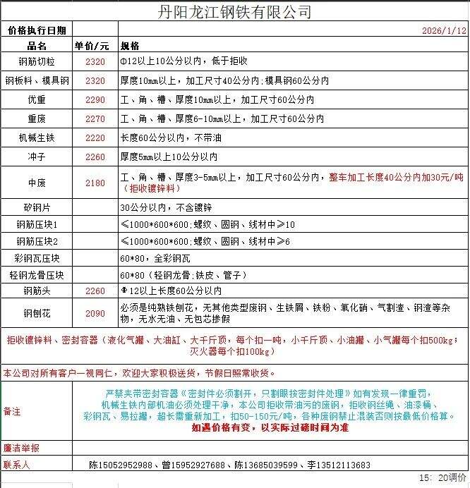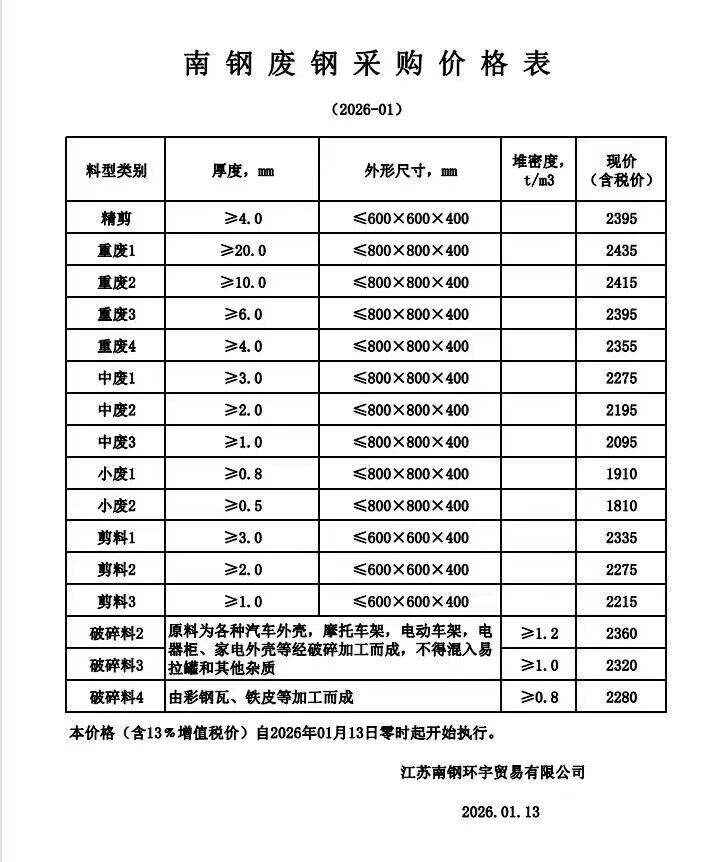 江苏敬业基地计划于****年*月**日**时起含税价格:统一上调**元/吨。钢板料(*mm)****元/吨,重废一(**mm)****元/吨,重废二(*mm)****元/吨,重废三(*mm)****元/吨,次重废(*mm)****元/吨,特级破碎料*类****元/吨。