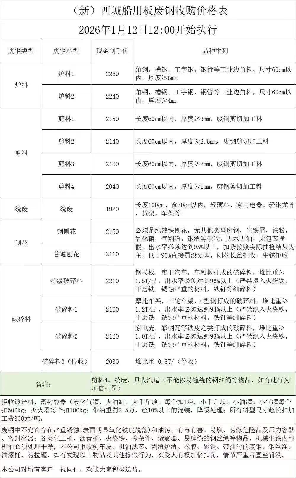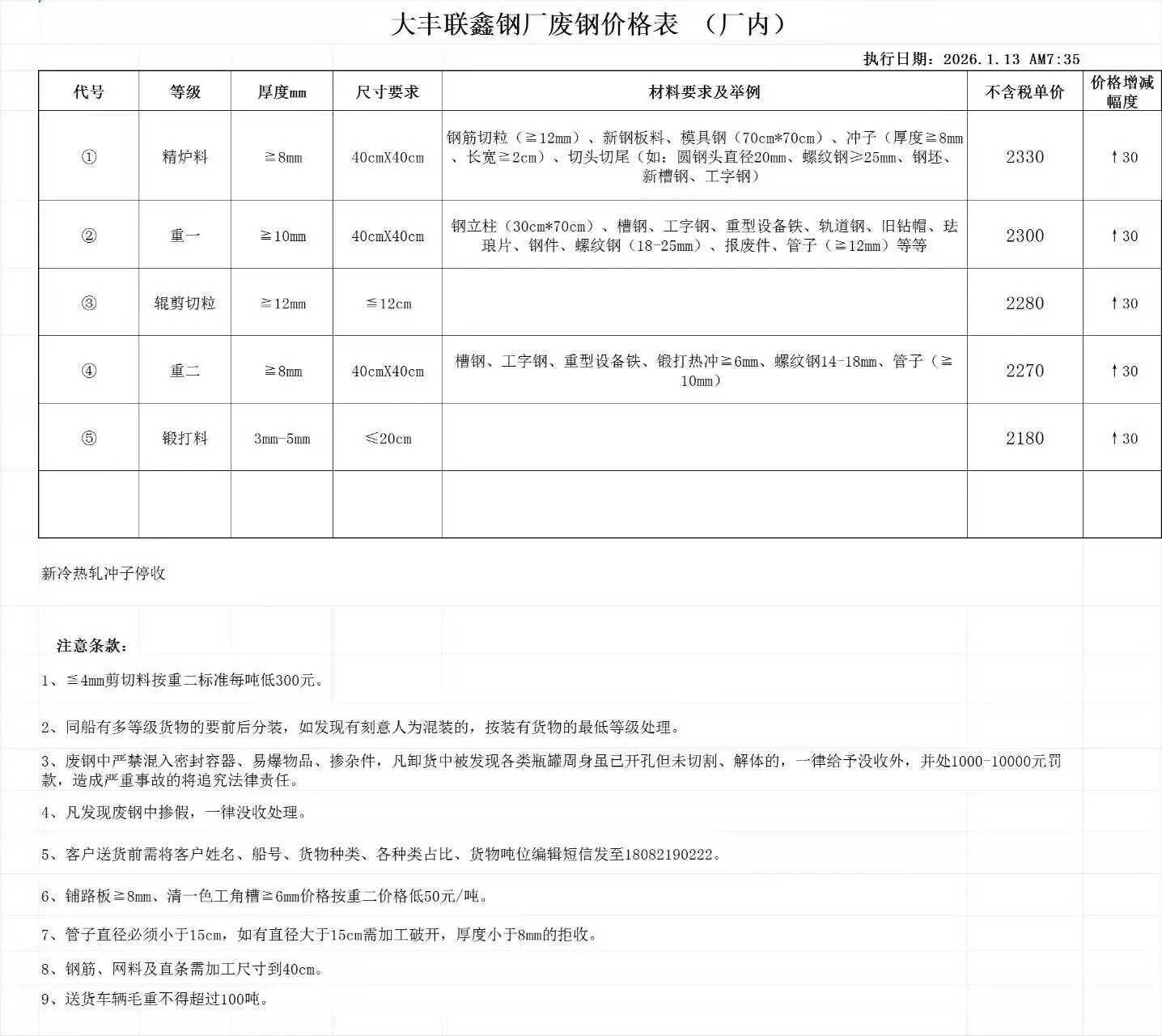 连云港亚新通知:*月**日废钢价格上调**元/吨:一、**毫米厚新钢板料,模具钢,价****元;二、*毫米厚度以上锻打毛边,价****-****元;三、重废A,价****元;四、*毫米厚重废B,价****元;五、*毫米厚中废新料,价****-****元。*毫米厚度以下拒收,车面与车底等级不一,按掺假处理。规格:**X**。超长度需重新加工:(*)占**%以上扣**元/吨(*)占**%以上扣***元/吨(*)化工厂料,带油料,高硫废钢,油漆桶废钢一律拒收。所有密封容器(如:千斤顶,汽车液压顶,各类气瓶,罐,密封管件等),必须彻底切断处理,如未彻底切断,重罚*****元以上/件。