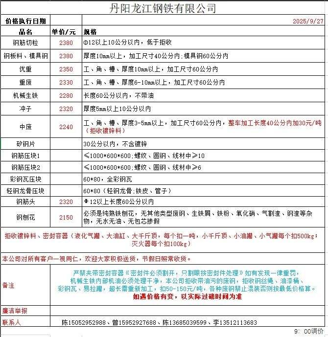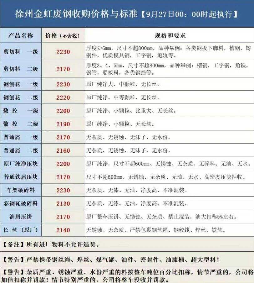 通知:徐州金虹钢铁****年*月**日**:**时起(具体以车辆过磅时间为准),所有料型统一下调**元/吨,徐州金虹,剪切料二级****,钢刨花一级****,钢刨花二级****,数控一级****,数控二级****,普通屑一级****,普通屑二级****,普通铁屑压块****,车架破碎料****,彩钢瓦破碎料****,油屑压饼****,长丝(原厂)****