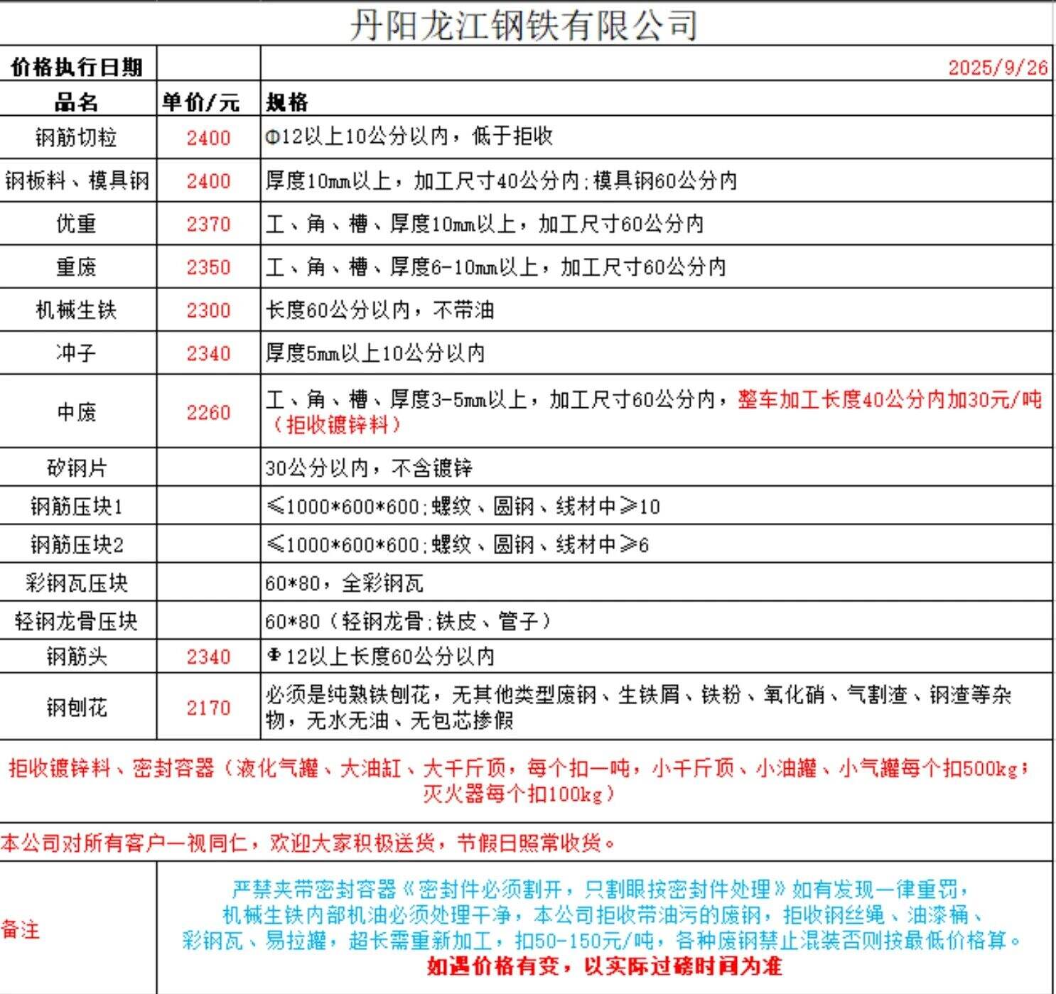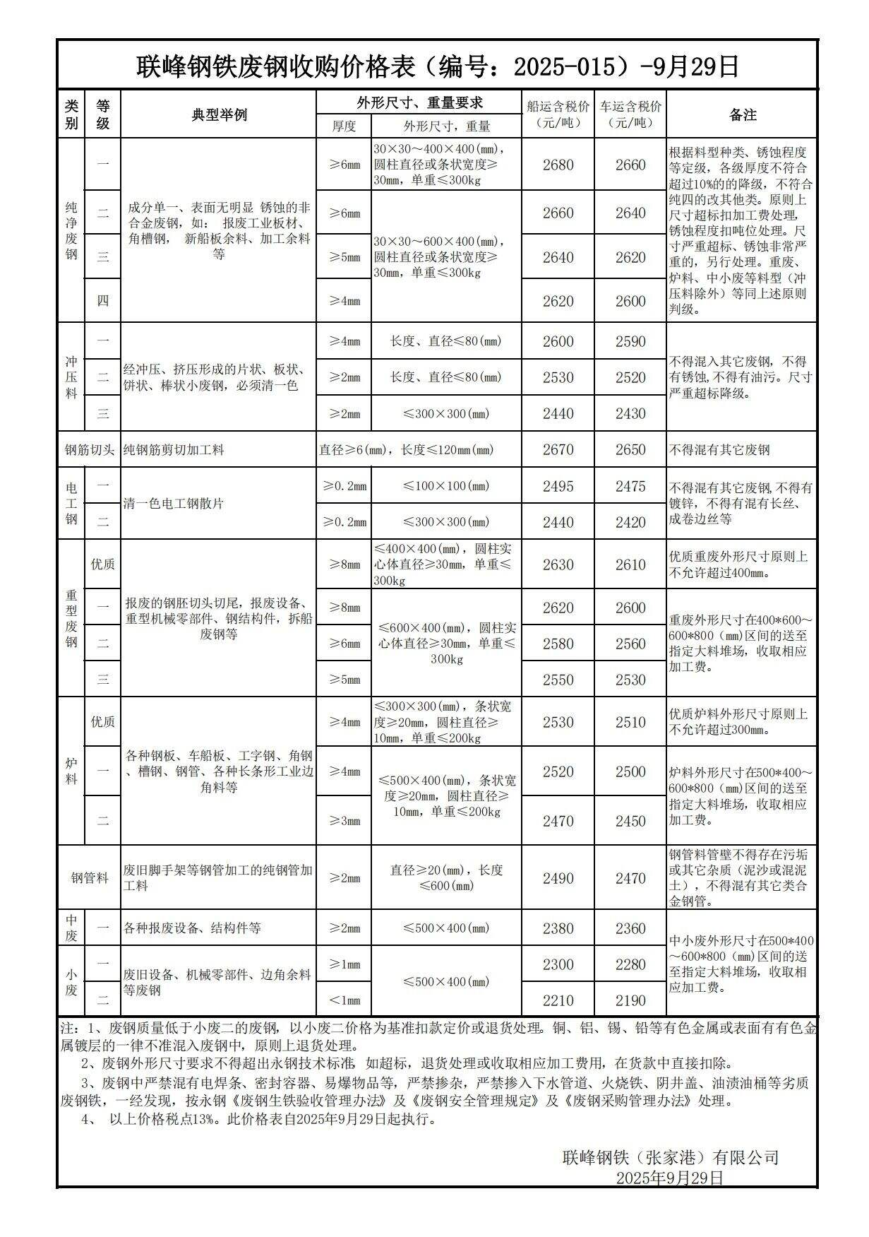 连云港亚新通知:*月**日中午**:**后废钢价格下调 ** 元/吨:一、** 毫米厚新钢板料,模具钢,价**** 元;二、*毫米厚度以上锻打毛边,价****-****元;三、重废A ,价**** 元;四、*毫米厚重废B,价**** 元;五、*毫米厚中废新料,价****-****元。*毫米厚度以下拒收,车面与车底等级不一,按掺假处理。规格:**X**。超长度需重新加工:(*)占**%以上扣**元/吨(*)占**%以上扣***元/吨(*)化工厂料,带油料,高硫废钢,油漆桶废钢一律拒收。所有密封容器(如:千斤顶,汽车液压顶,各类气瓶,罐,密封管件等),必须彻底切断处理,如未彻底切断,重罚*****元以上/件。