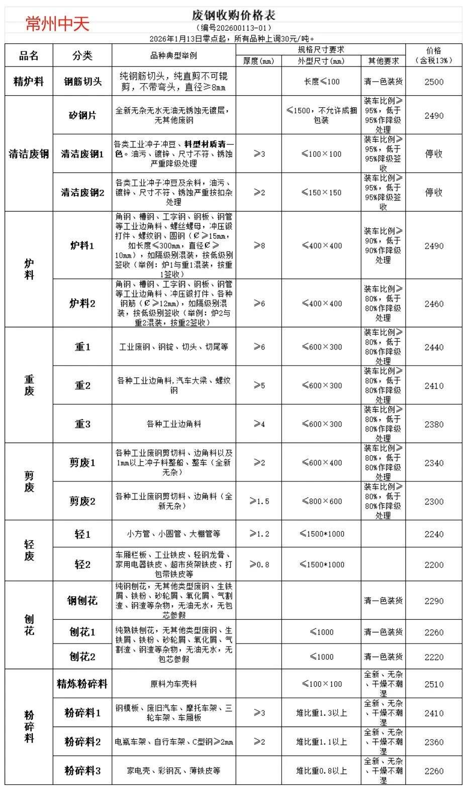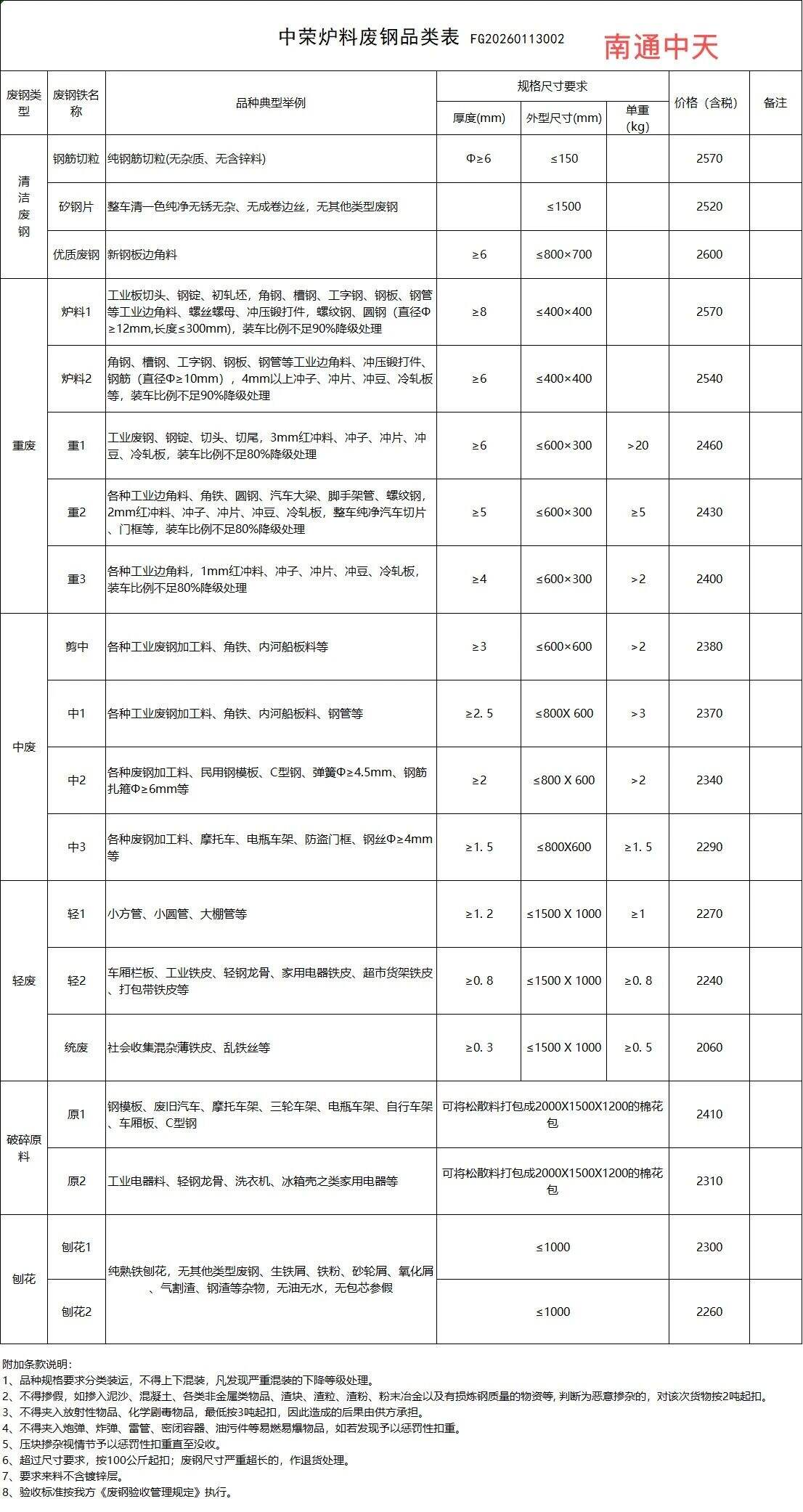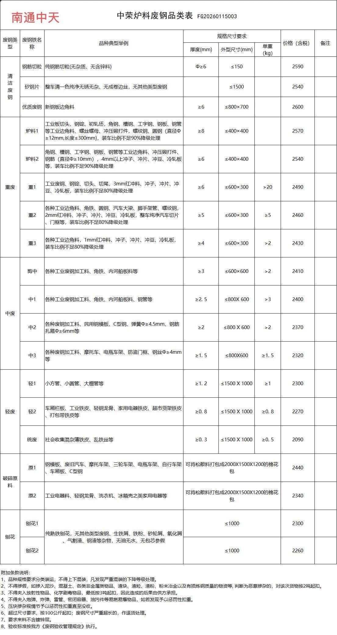 *月**日南通中天优质废钢、炉料上调**元/吨,其他品类不变。