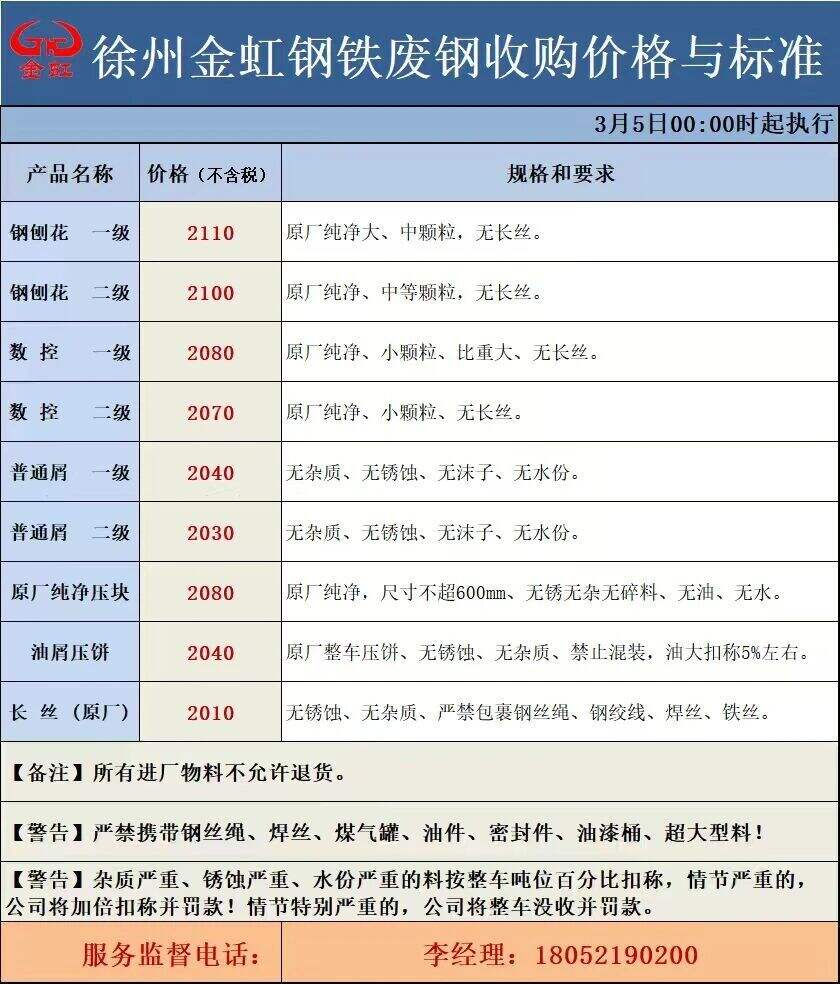 徐州金虹钢铁****年*月*日**:**时起(具体以车辆过磅时间为准),所有料型统一上调**元,钢刨****-****普屑****-****原厂纯净压块****铁屑压饼****长丝(原厂)****