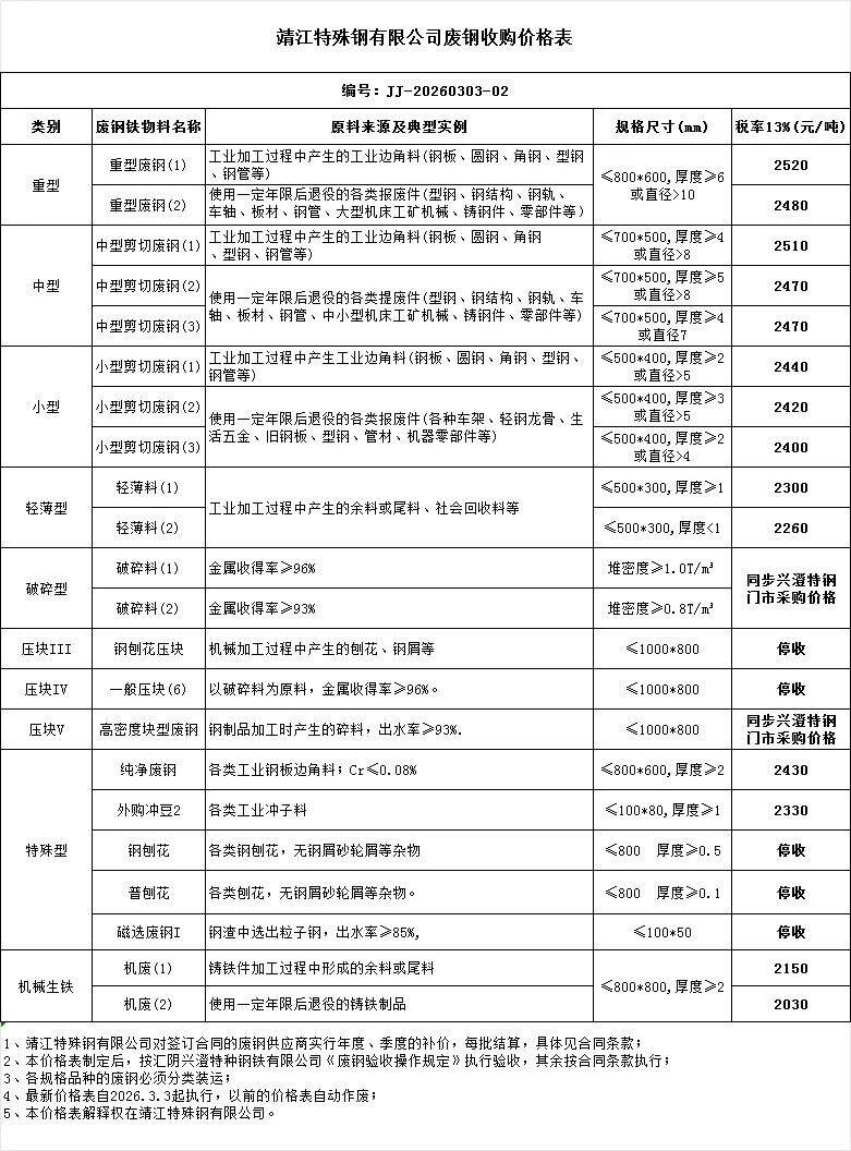 江苏敬业基地计划于****年*月*日*时起含税价格:废钢统一上调**元/吨。钢板料(*mm)****元/吨,重废一(**mm)****元/吨,重废二(*mm)****元/吨,重废三(*mm)****元/吨,次重废(*mm)****元/吨,特级破碎料*类****元/吨。