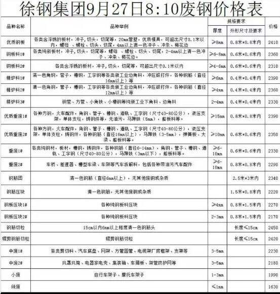 徐钢集团*月**日*:**开始废钢下调价格,调整后:优质钢板****,钢板料*.****,精炉料*.****,优质重废*.****,重废*.****,钢筋团****,钢筋压块****,钢板压块*.****,钢筋切粒****,中废*.****,中废*.****,小废****,统废****,详见价格表。 送货联系:魏经理*********** 微信同号:****-********转***