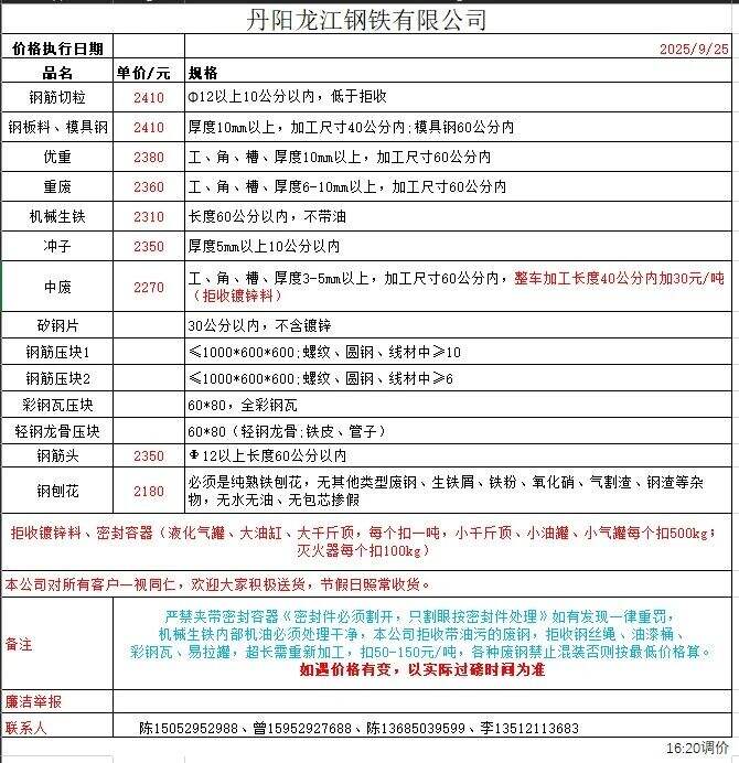 **日华航特钢。上调**元,优重**以上:****元,生铁:****元,(重废*)*以上:****元,(重废*)*-*:****元,中废*-*:****元,剪料-:****元,钢刨花:****元,数控刨花:****元,普通刨花:****元,所有尺寸加工**公分以内。密封管一个罚款****元,发现掺假按*吨至**吨处罚严重的整车没收。