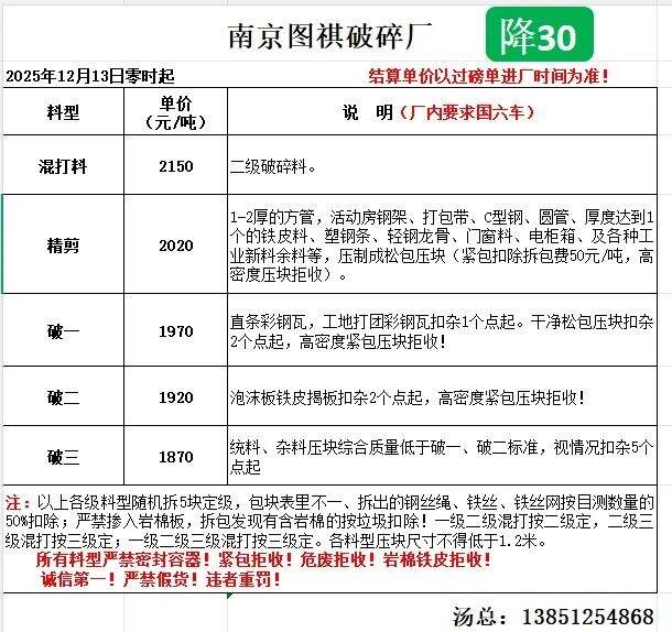 南通九圩港天泽码头现款收:*以上新钢板炉料****、毛料****-****;重废、工角槽****-****;**上直钢筋****;桥梁模板、拆船毛料****-****左右;*以上激光板****;彩钢瓦****-****;气割料、大件生熟铁看货定价。密封容器.含油废钢拒收。可带票,价格另议。联系电话*********** 入场人员请佩戴安全帽!