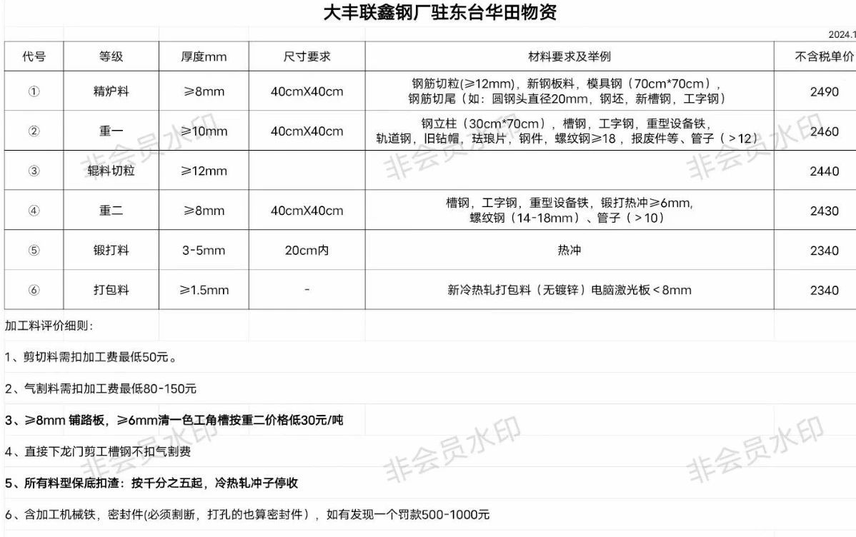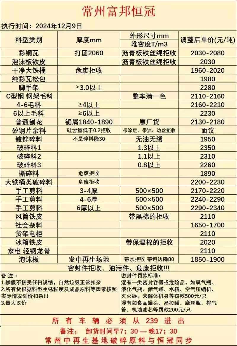 *:黑色打包带、楼板筋、镀锌瓦、通风管、桥架、马口铁皮、纯棉花包、冰箱洗衣机外壳、****-*****:打团彩钢瓦、清一色纯彩钢瓦:****-****