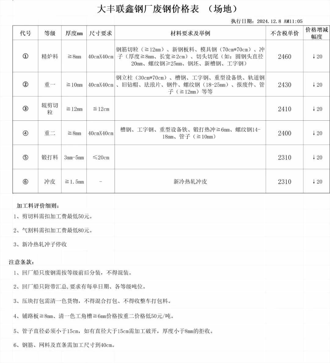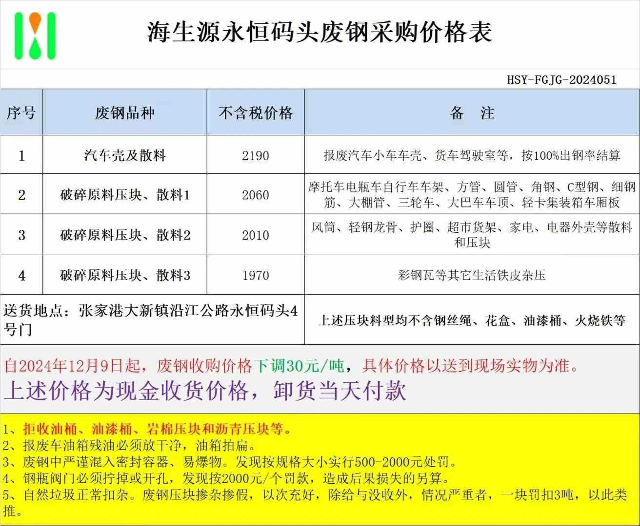 自****年**月*日起,张家港永恒码头废钢采购价格下调**元/吨。具体以送到现场实物为准。送货联系王经理,电话***********。