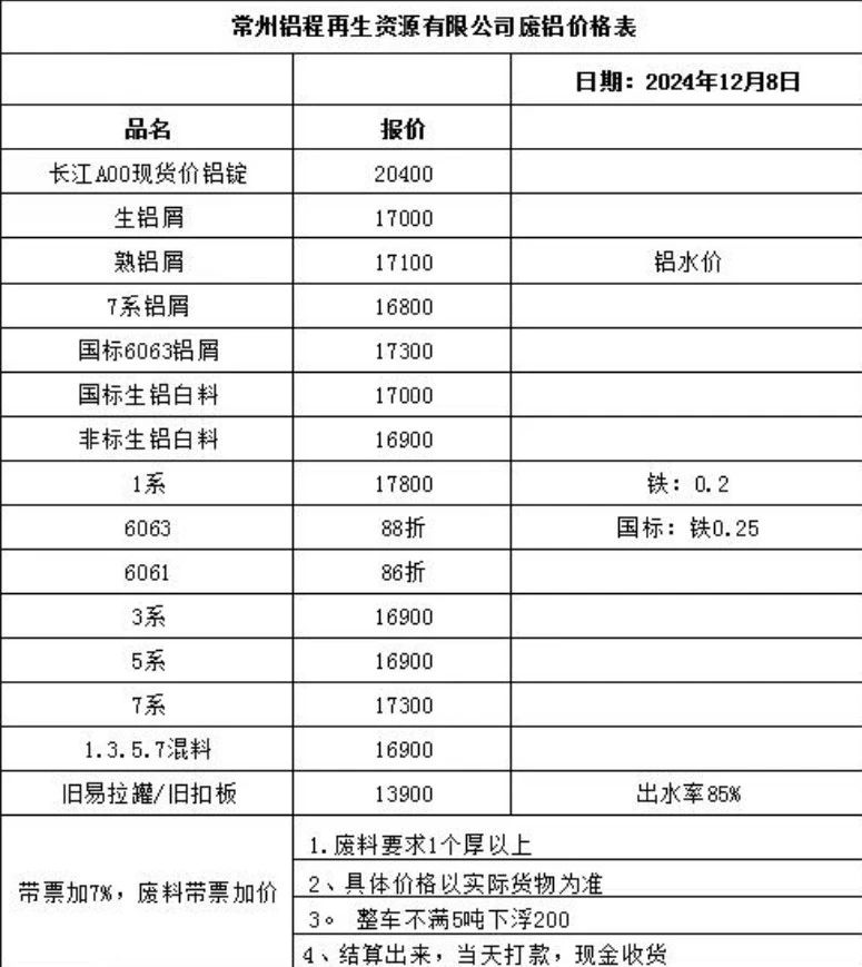****年**月*日常州铝程再生资源有限公司废铝价格表