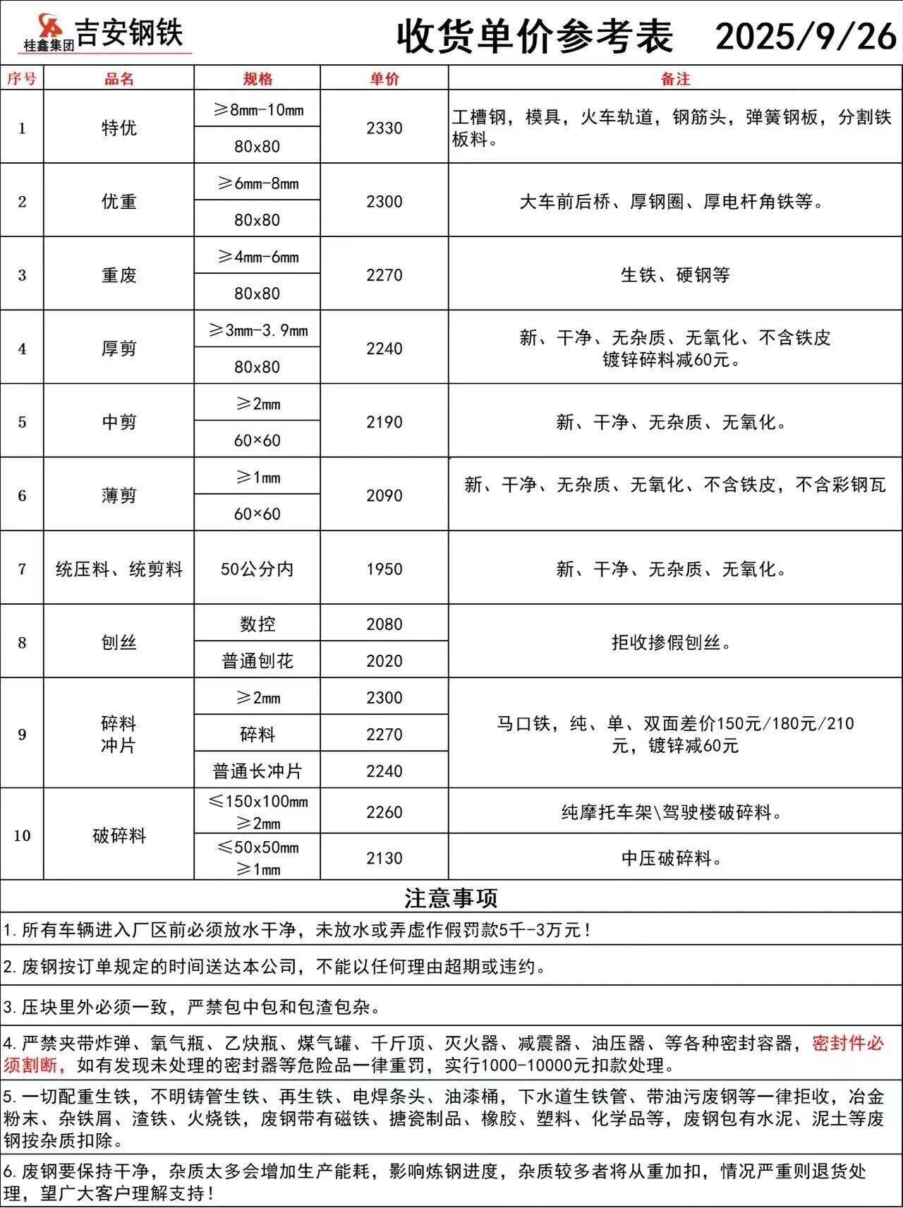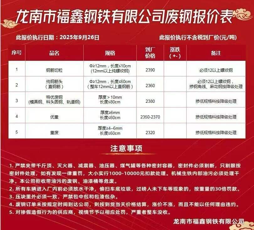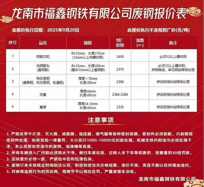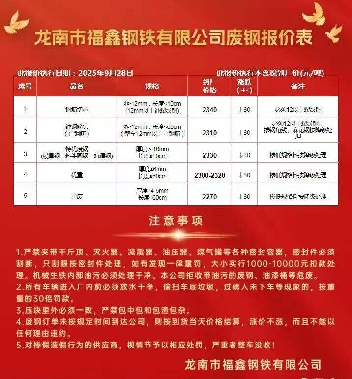 方大特钢废钢自****年*月**起:,散料废钢上调**元/吨,钢筋压块上调**元/吨,边角料压块*上调**元/吨,边角料压块*上调**元/吨,边角料压块*上调**元/吨,A级社会压块上调**元/吨,普通压块上调**元/吨,工业压块上调**元/吨,B级社会压块上调**元/吨,打包废钢压块上调**元/吨,打包废钢压块*上调**元/吨,汽车壳压块上调**元/吨,汽车轮胎丝上调**元/吨,干磨火烧铁上调**元/吨,其他料型不变。