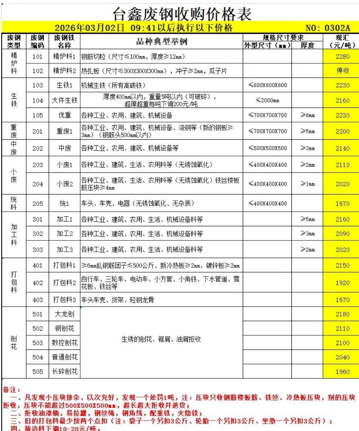 方大特钢废钢自****年*月**起:散料废钢上调**元/吨,钢筋压块上调**元/吨,边角料压块*上调**元/吨,边角料压块*上调**元/吨,边角料压块*上调**元/吨,A级社会压块上调**元/吨,A*级社会压块上调**元/吨,普通压块上调**元/吨,B级社会压块上调**元/吨,打包废钢压块*上调**元/吨,汽车壳压块上调**元/吨,汽车轮胎丝上调**元/吨,一级废钢压块上调**元/吨,二级废钢压块上调**元/吨,其他料型不变。