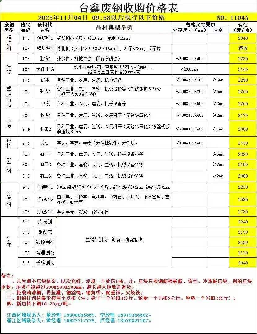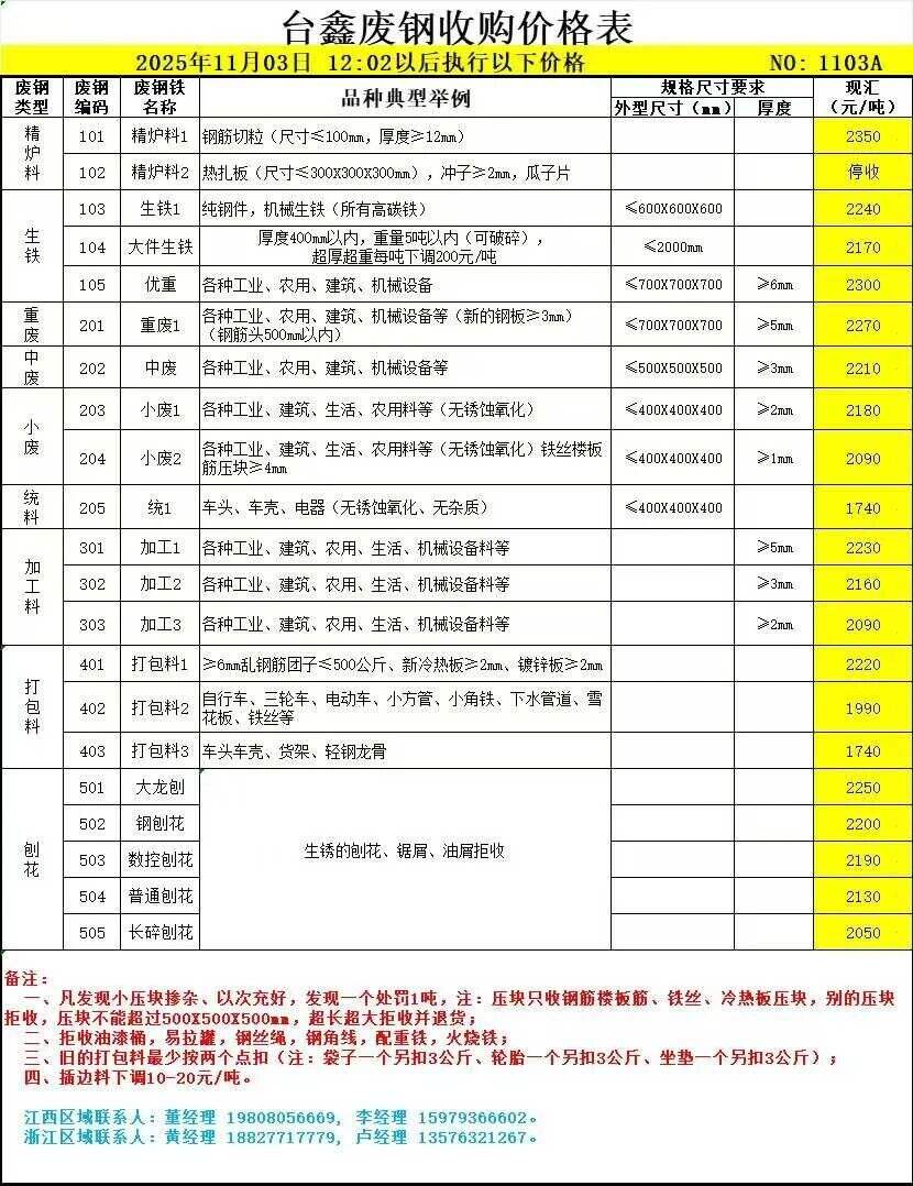 *日台鑫废钢最新价,跌**:精炉料一****,生铁一****大件生铁****优重****;重废一****;中废****小废一****小废二****统一****加工料****-****打包料****-****大龙刨****,钢刨花****,普通刨花****,长碎刨花****,不含税。