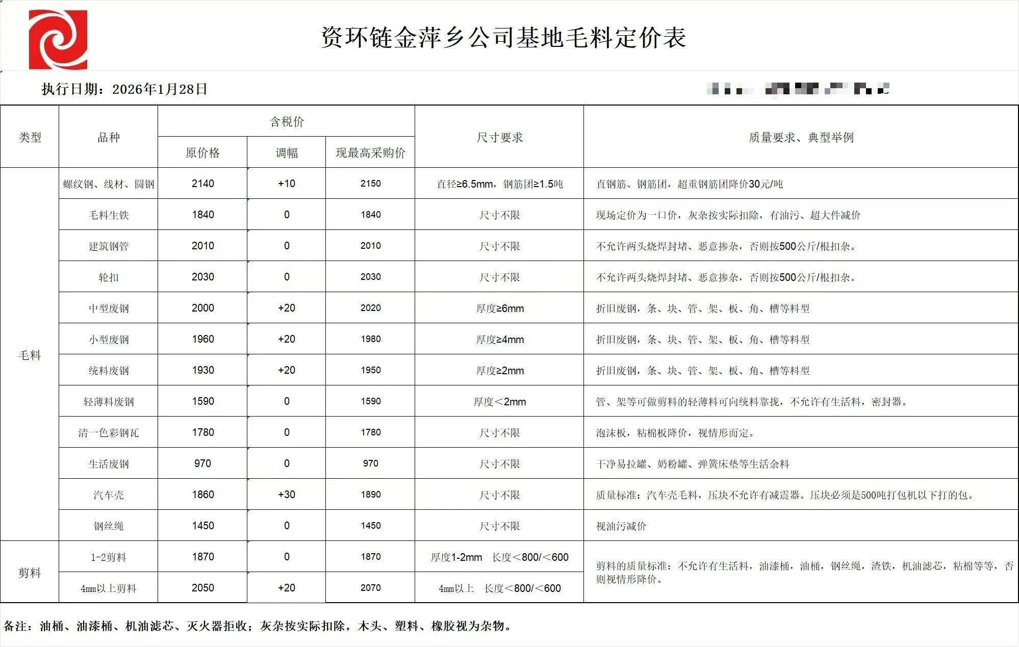 *月**日,公司货场毛料钢筋价格上调**元/吨,汽车壳价格上调**元/吨,毛料统料,小型,中型价格上调**元/吨。合格料*毫米以上价格上调**元/吨,取消*至*毫米剪料。