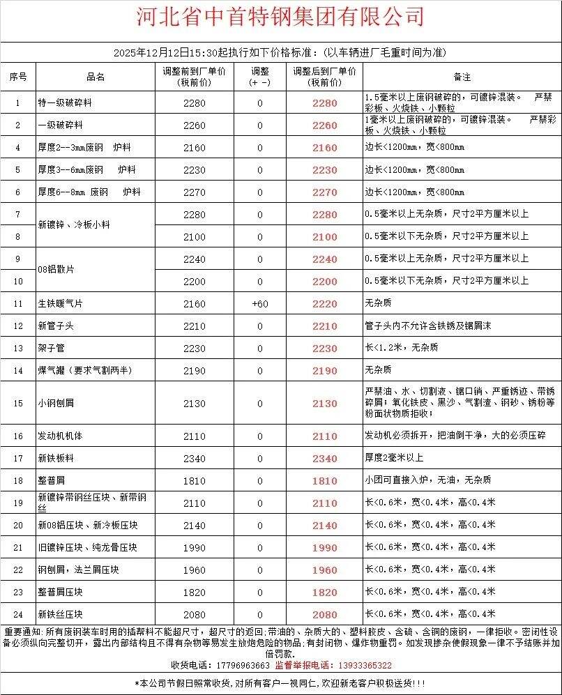 中首特钢通知破碎料暂时停收,开收时间另行通知。