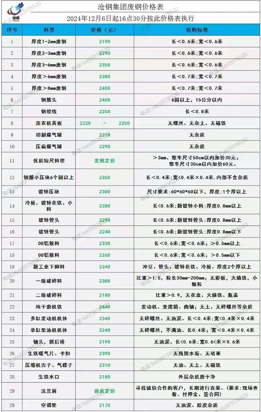 沧钢通知:****年**月*日*:**起废钢价格下调**元,*-*厚****,*-*厚废钢****,*-*厚废钢****,*厚废钢****,*厚****,钢筋头****,一级破碎料****,二级破碎料****,生铁暖气片****,生铁水口****,不含税