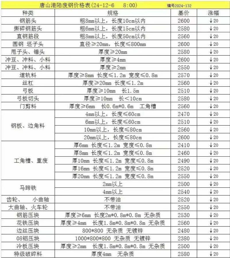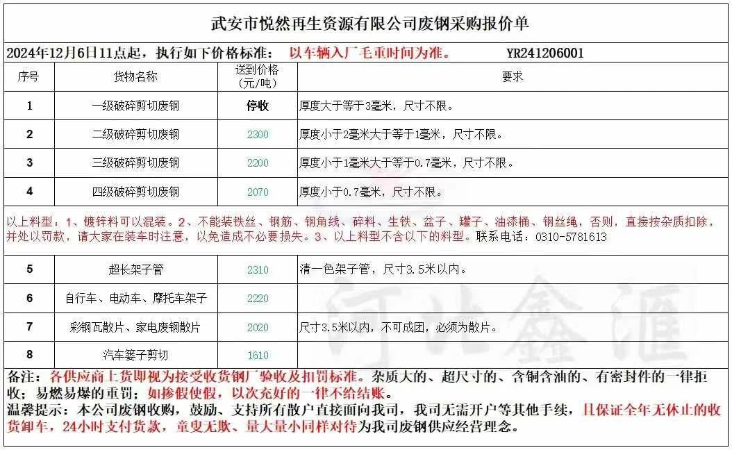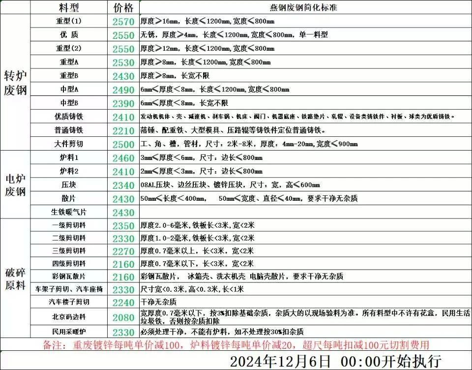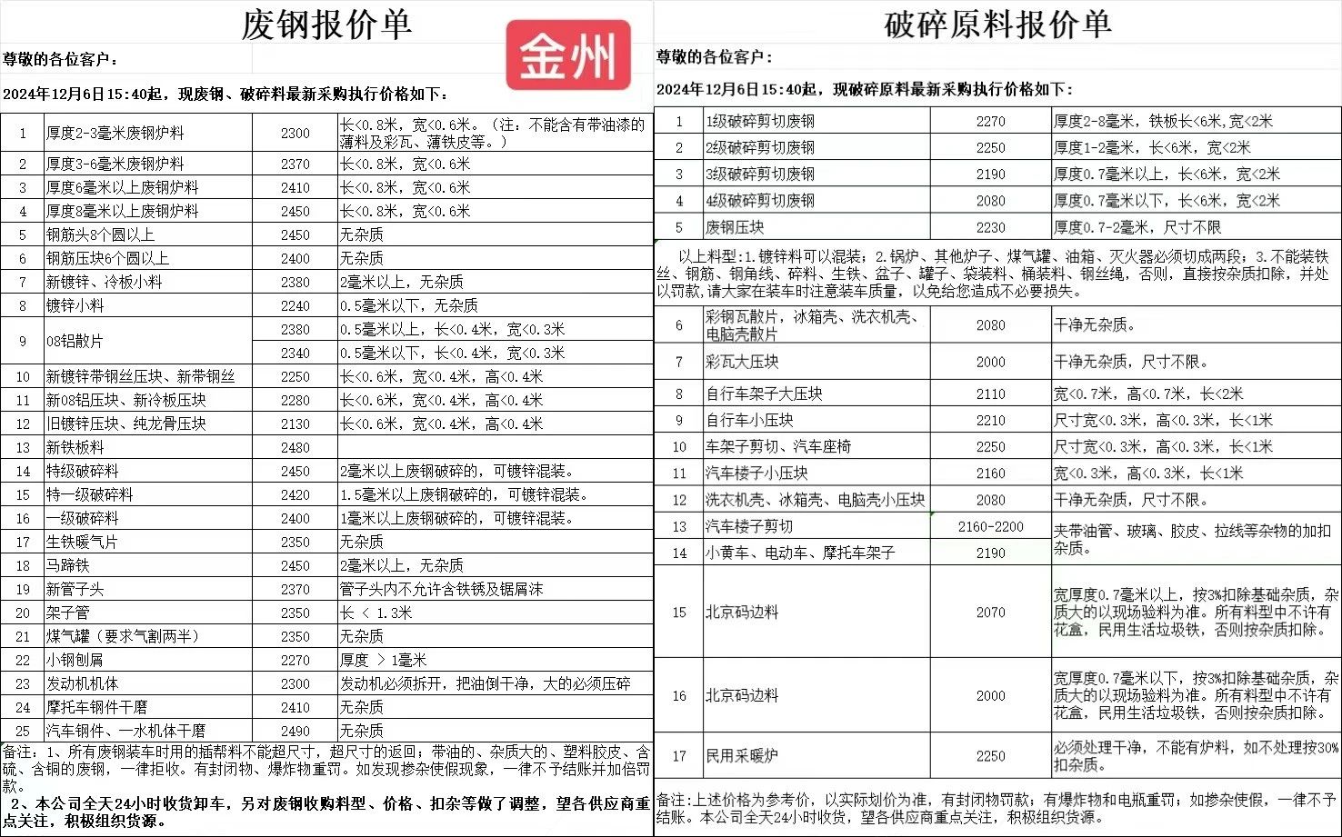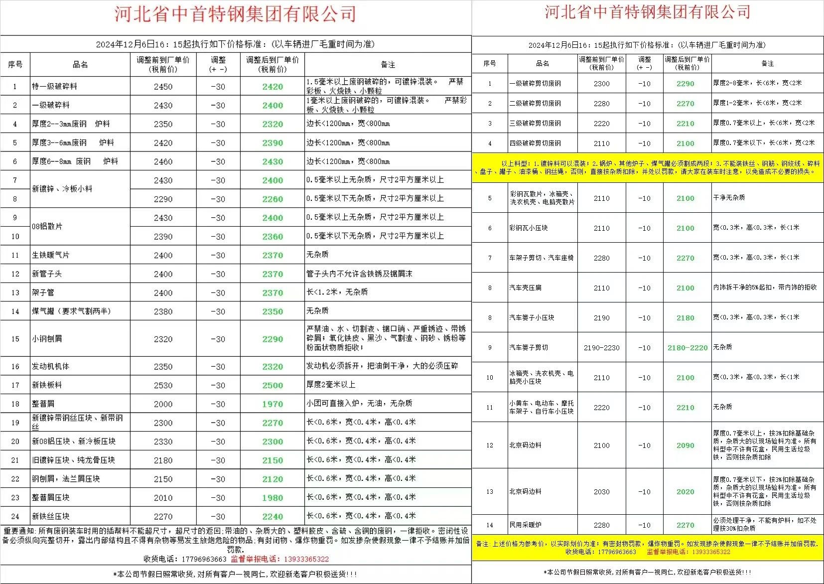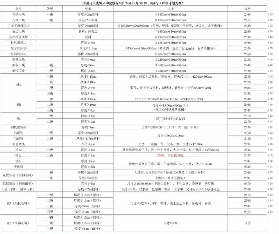 自****年**月*日**点起,鑫汇、悦然所有料型价格下调**元,废钢,精品小料停收,钢筋头停收,普废****中废****一级小废****:**铝散片****新小料****新钢板料停收,发动机机体****架子管****小钢刨屑****,破碎一级****破碎二级****破碎三-级****,不含税,悦然车间执行价,一级破碎剪切废钢停收,二级破碎剪切废钢****,三级破碎剪切废钢****,四级破碎剪切废钢****超长架子管****,自行车、电动车、摩托车架子****,彩钢瓦散片、家电废钢散片****,汽车篓子剪切****