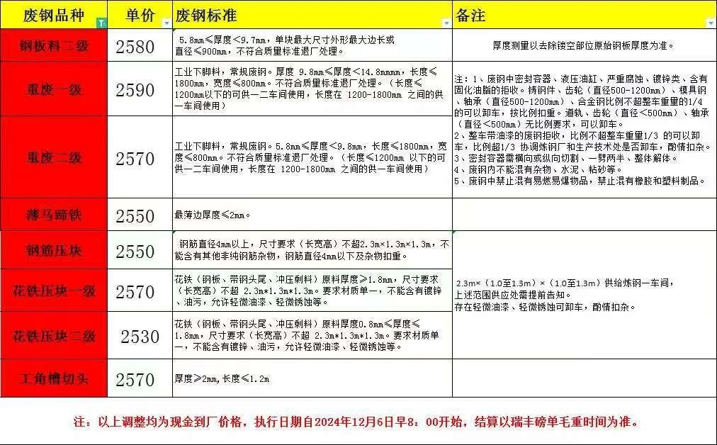 瑞丰通知,降**,钢板料二级****,重废一级****,重废二级****,薄马蹄铁****,钢筋压块****,花铁压块一级****,花铁压块二级****,工角槽切头****注:以上调整均为现金到厂价格