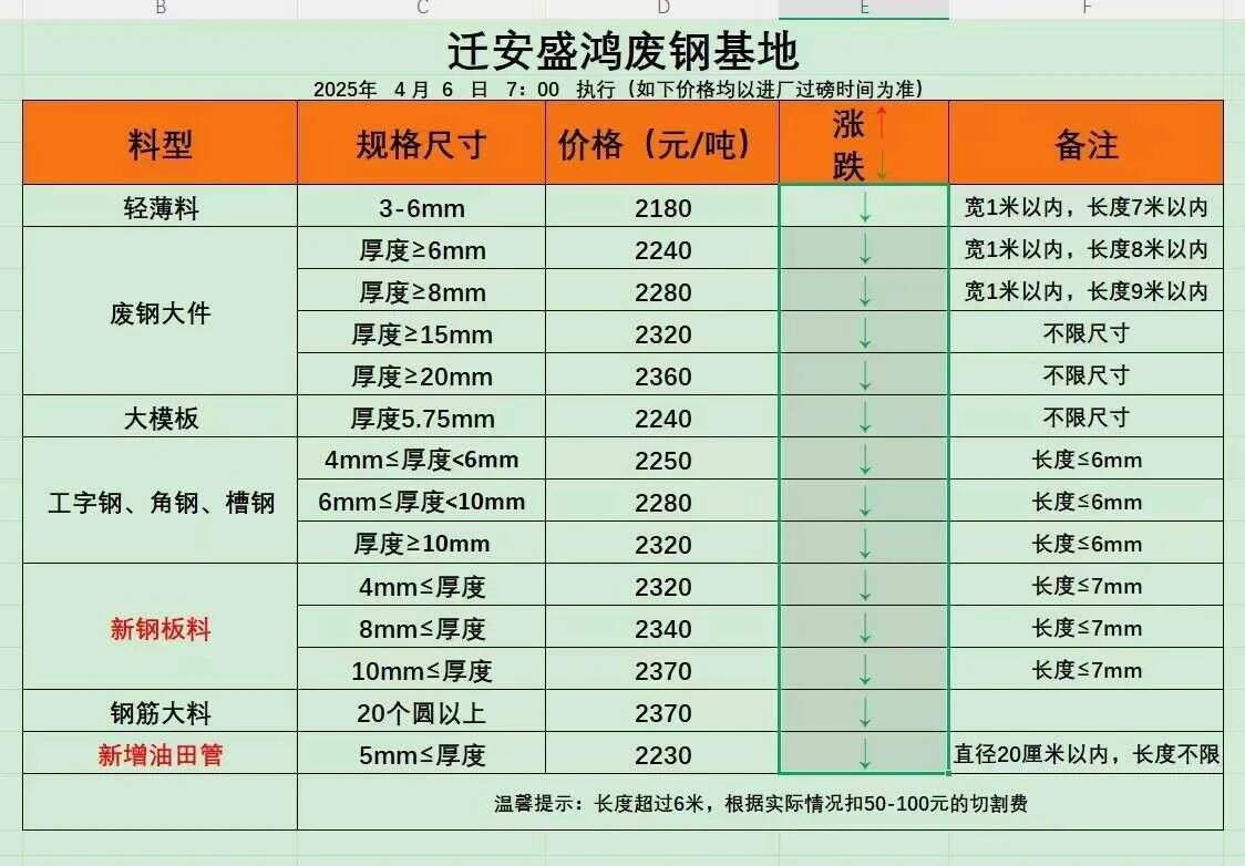 唐山华赢商贸(双赢集团废钢加工基地):*月**日**:**起,所有料型上调**元,超尺可议,详见价目表。不限车型、卸车迅速、付款及时,欢迎新老客户联系垂询、踊跃供货!