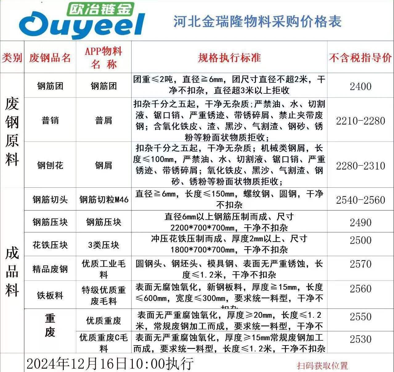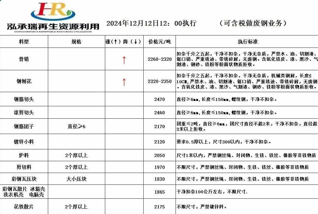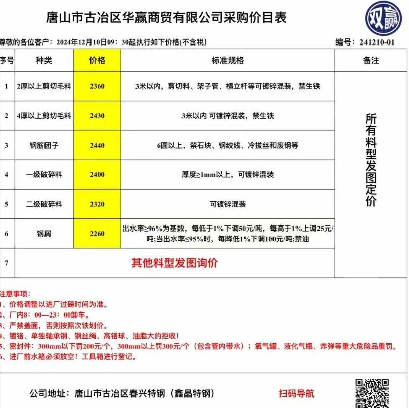 古冶区华赢基地废钢采购通知:****年**月**日**:**起,部分料型调整,可镀锌混装,土大拒收,详见价目表。欢迎新老客户洽谈、合作!