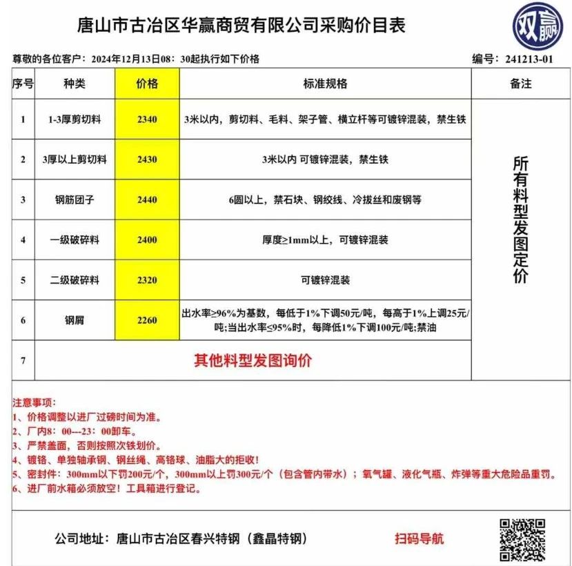 河北古冶区华赢基地废钢采购通知:****年**月**日**:**起,部分料型调整,详见价目表。欢迎新老客户洽谈、合作!