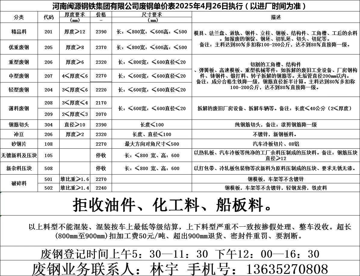 林州凤宝特钢最新合同,四个厚重废结算价,****