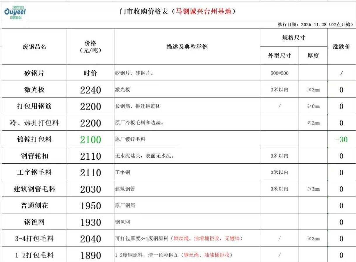 马钢诚兴台州基地 ** 月 ** 日镀锌打包料下调 ** 元/吨,请各位供应商知悉。