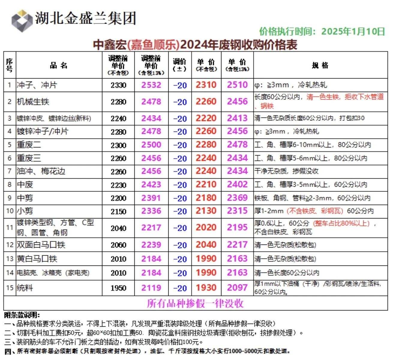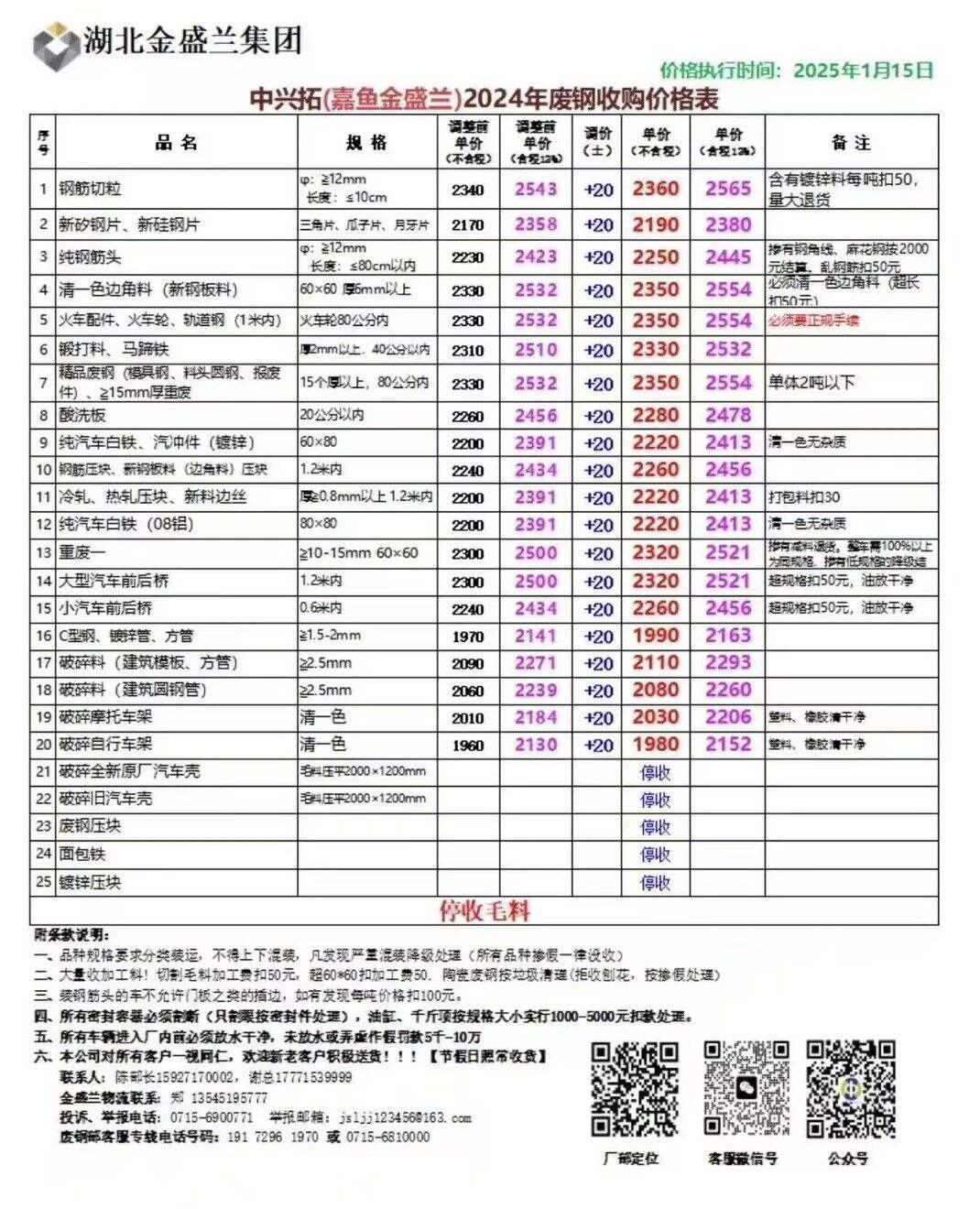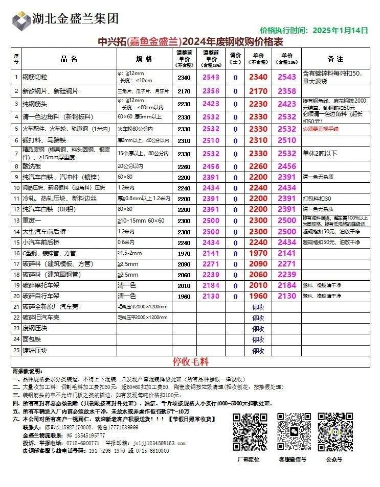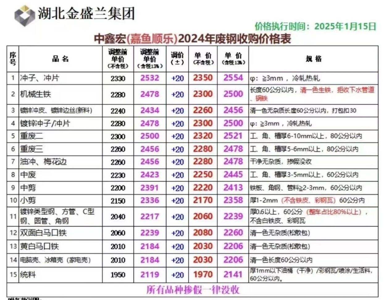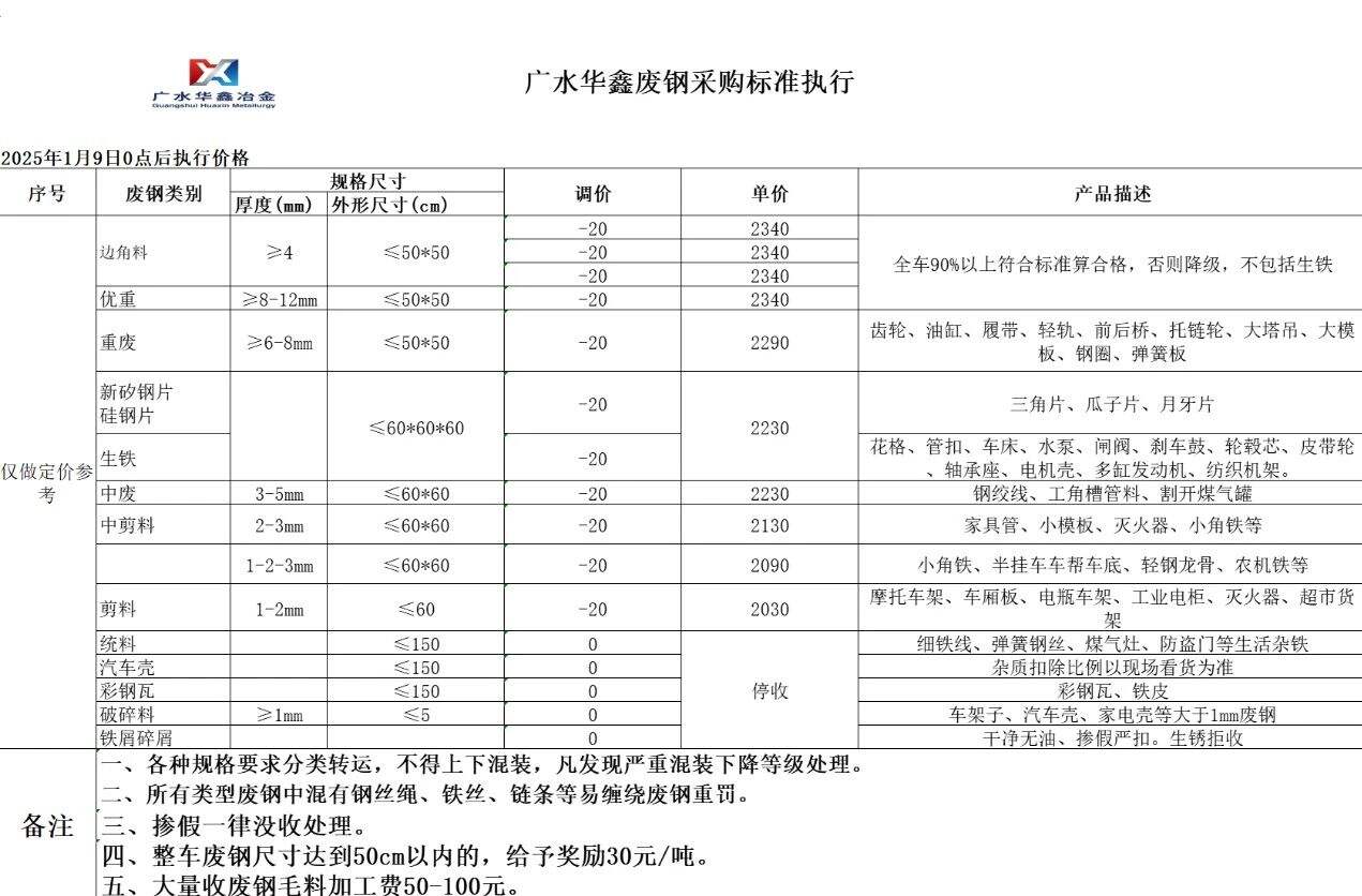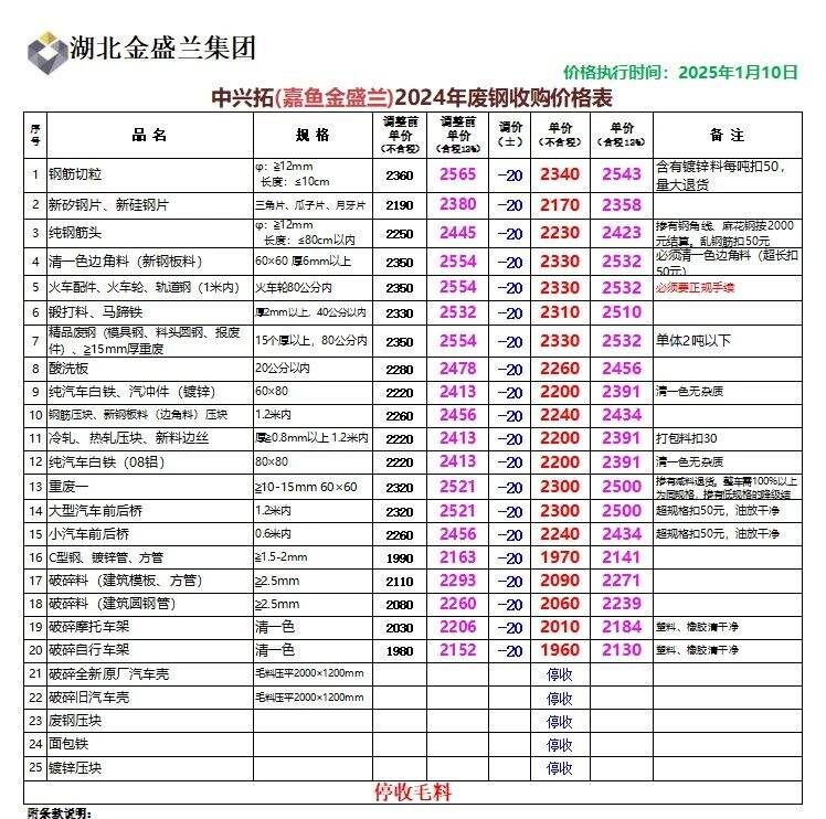 **日湖北嘉鱼金盛兰不变,钢筋切粒****,新矽钢片、新硅钢片****,纯钢筋头****,清一色边角料(新钢板料)****,火车配件、火车轮、轨道钢(*米内)****,锻打料、马蹄铁****,精品废钢(模具钢、料头园钢、报废件)、***mm厚重废****,酸洗板****,纯汽车白铁、汽冲件(镀锌)****,钢筋压块、新钢板料(边角料)压块****,冷轧、热轧压块、新料边丝****,纯汽车白铁(**铝)****,重废一****,大型汽车前后桥****,小汽车前后桥****,C型钢、镀锌管、方管****,破碎料(建筑模板、方管)****,破碎料(建筑圆钢管)****,破碎摩托车架****,破碎自行车架****,不含税