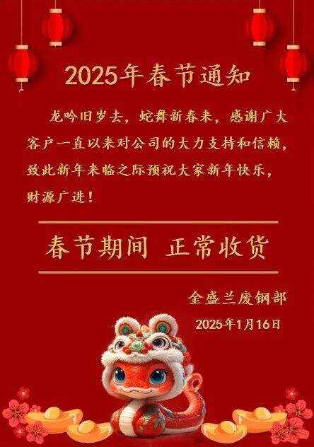 金盛兰废钢部****年春节通知:龙吟旧岁去,蛇舞新春来,感谢广大客户一直以来对公司的大力支持和信赖,致此新年来临之际预祝大家新年快乐,财源广进!春节期间正常收货