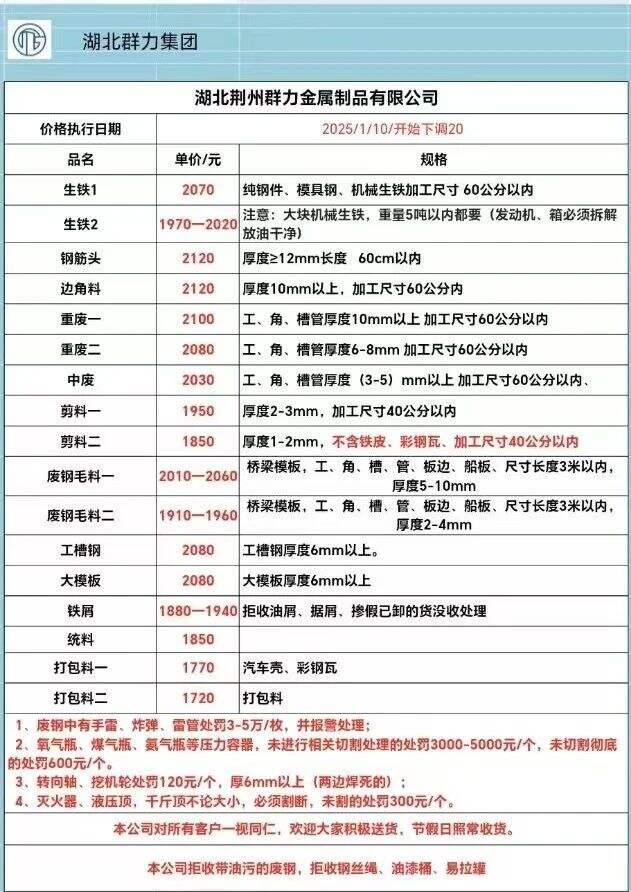 **日荆州群力跌**最新,生铁*:****,生铁*:****-****,钢筋头****,边角料****,重废一****,重废二****,中废****,剪料一****,剪料二****,废钢毛料一****-****,废钢毛料二****-****,工槽钢****,大模板****,铁屑****-****,统料****,打包料一****,打包料二****