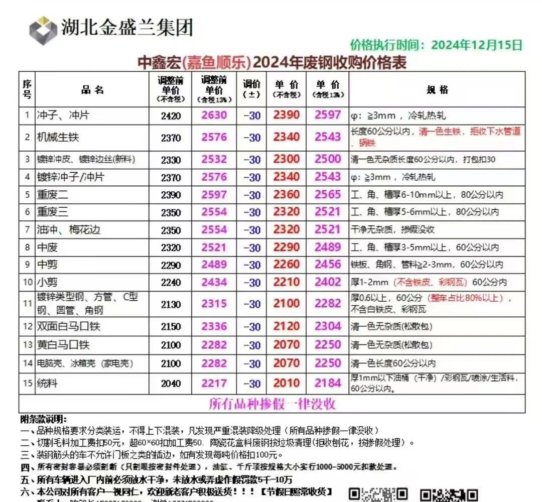 **日湖北嘉鱼金盛兰跌**最新,钢筋切粒****,新矽钢片、新硅钢片****,纯钢筋头****,清一色边角料(新钢板料)****,火车配件、火车轮、轨道钢(*米内)****,锻打料、马蹄铁****,精品废钢(模具钢、料头园钢、报废件)、***mm厚重废****,酸洗板****,纯汽车白铁、汽冲件(镀锌)****,钢筋压块、新钢板料(边角料)压块****,冷轧、热轧压块、新料边丝****,纯汽车白铁(**铝)****,重废一****,大型汽车前后桥****,小汽车前后桥****,C型钢、镀锌管、方管****,破碎料(建筑模板、方管)****,破碎料(建筑圆钢管)****,破碎摩托车架****,破碎自行车架****,不含税